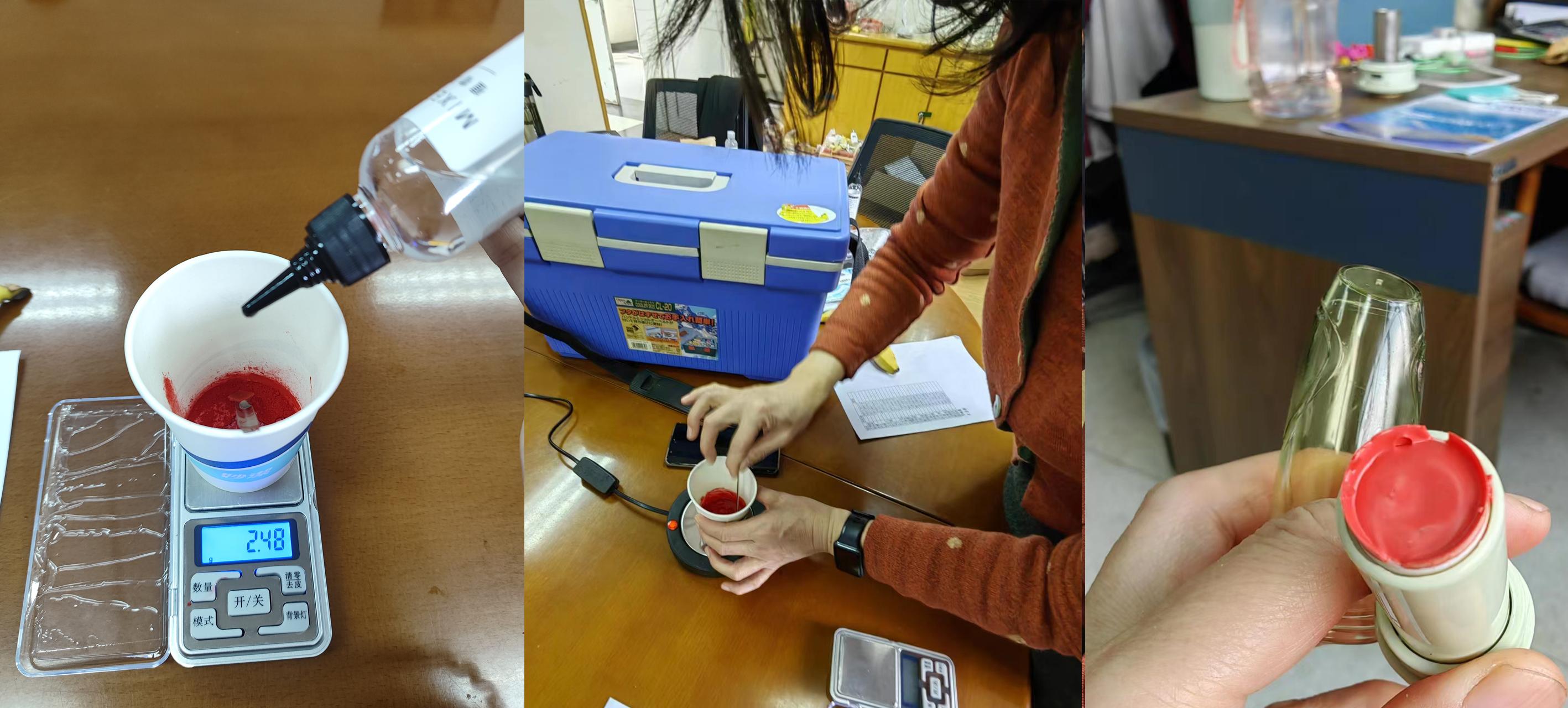 首先称量适量的口红颜料到纸杯中,依次加入油脂、不同种类的蜡、精油、维生素E等等。DIY的魅力就在于可以自由选择甚至调配出自己喜爱的颜色。通过选择精油的种类还可以拥有自己喜欢的香味如柠檬味道、桂花味等;喜欢珠光效果的可以加珠光粉。大家像重新回到化学实验室一样,小心翼翼地称量、认真地在小炉子上加热搅拌。经过耐心地等待加热和持续搅拌,蜡粒终于充分溶解,然后就可以罐装等待降温冷却后成形。成品口红还有不同风格的管和统一的外包装。