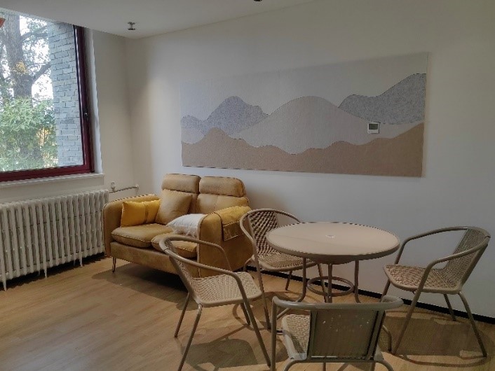 一进入教工之家,墙上的毛粘画即映入眼帘,让人有了家的温馨感。通过教工之家的窗户,可以看到西面的风景。这里有舒适的沙发,也有一桌四椅供老师们围坐约个棋牌游戏等。椅子是仿藤椅的,结实、舒适。沙发最舒适,桌椅则便于四人围坐聊天;沙发和桌椅也可以再组合变成六人围坐;以此满足老师们的各种需求。沙发和桌椅的款式、颜色与毛毡画和地板搭配合适,给人雅致愉悦的感觉。