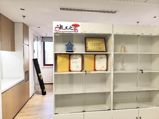 教工之家的展示柜则把六合彩开奖号码 工会各社团的奖杯等展示出来,并且将该空间隔离出私密性。