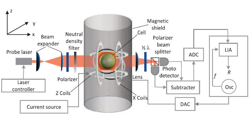 共磁力仪以高灵敏度原子磁力仪为基础,通过对磁场的高精度调控,实现对角加速度、引力场以及新奇异物理场的高精度测量,具有重要的基础科研价值以及实际应用价值。共磁力仪通常利用处于同一个原子气室中不同种类的原子来实现对磁场微小变化的共模感知和抑制。由于不同原子在空间上仍然存在一定的分离,磁场梯度会影响共磁力仪的测量结果,是共磁力仪主要的系统误差来源。