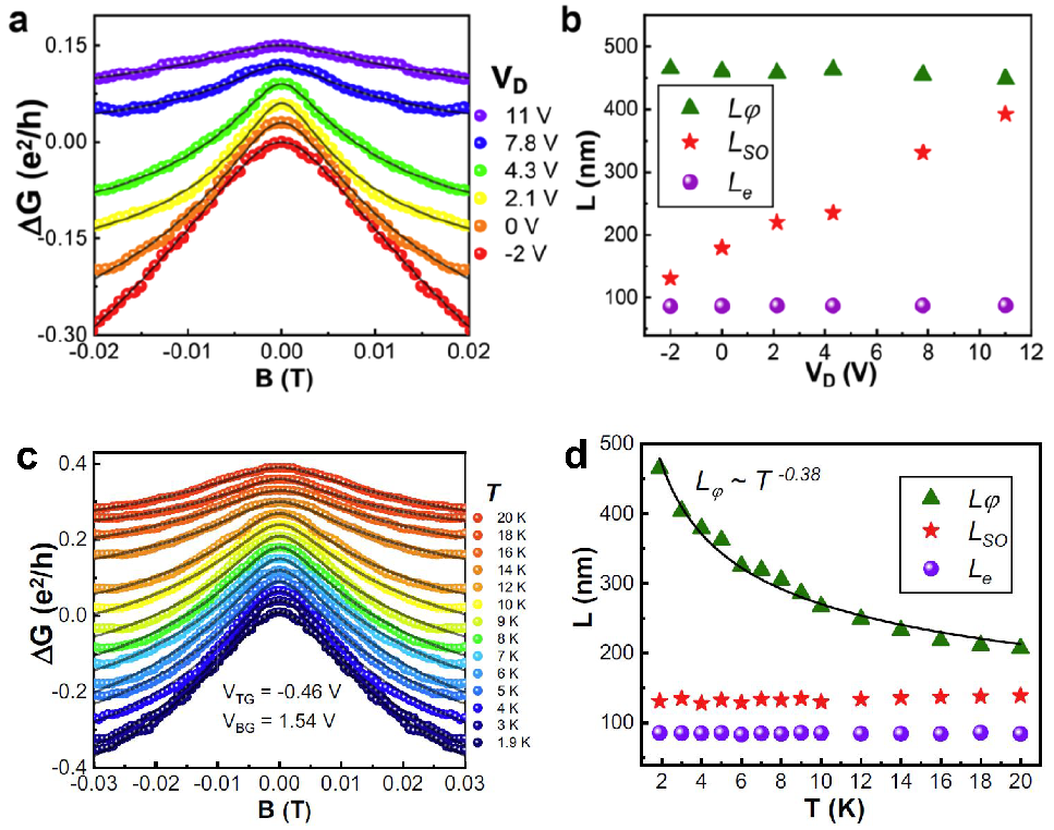 图二:(a)、(b)在不同双栅电势差(VD)下测得的低场磁阻曲线和从中提取到的电子的退相干长度,自旋-轨道耦合长度以及平均自由程随VD的演化关系,(c)、(d)在不同温度下测得的低场磁阻曲线和从中提取到的电子的退相干长度,自旋-轨道耦合长度以及平均自由程随温度的演化关系。