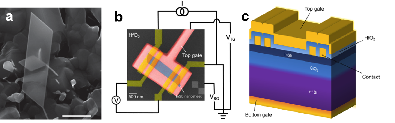 图一:(a) InSb纳米片在生长衬底上的扫描电镜照片,(b)双栅场效应器件的扫描电镜照片和测量线路图,(c)器件层状结构示意图。