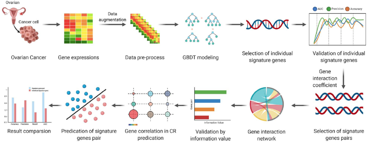 电子学系雷易鸣博士、北京大学第三医院妇产科郭红燕教授与澳大利亚新南威尔士大学、英国剑桥大学、美国杜克大学的研究人员合作,在基于机器学习辅助的人类卵巢癌耐药性预测方法研究领域取得重要进展。在该研究中,考虑到过往研究中存在基因维度过高导致基因相互作用网络非常复杂而难以理解,研究人员首先构建了一个基于梯度提升决策树的机器学习模型来选取标志基因。进而,研究人员提出了基因相互作用系数来定量衡量两个标志基因的相关性,并以此建立卵巢癌耐药性的基因相互作用网络。最后,研究人员提出了一种基于标志基因对的卵巢癌耐药性预测方法。