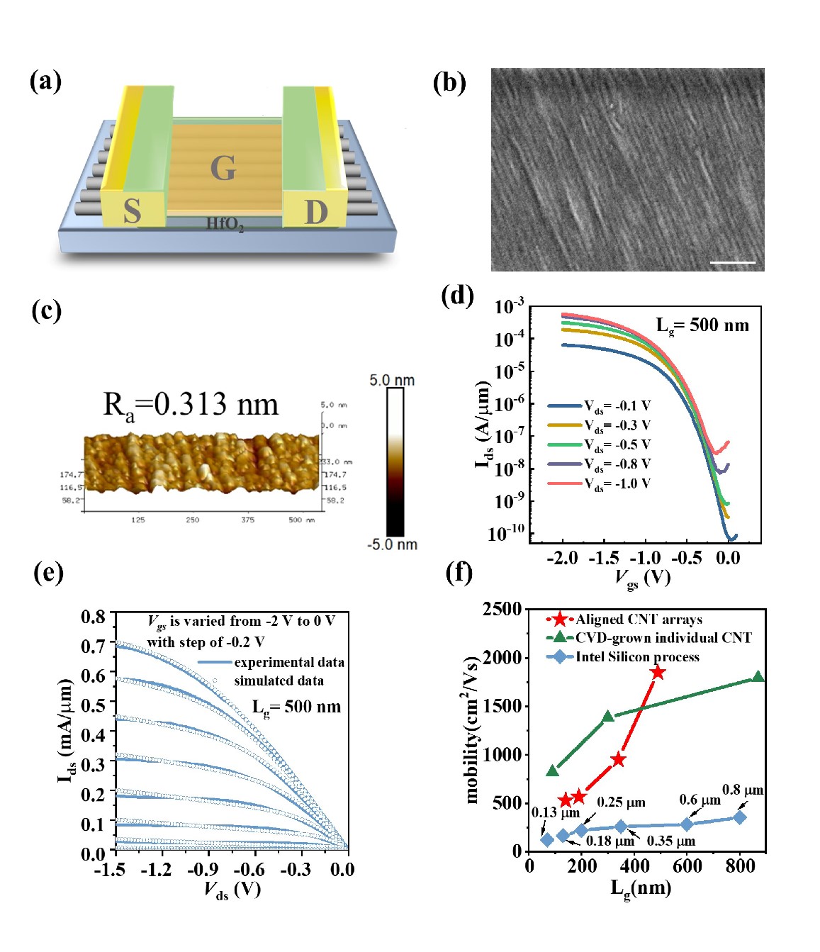 主流的硅基CMOS集成电路的发展遇到来自物理极限、器件功耗和加工成本等多方面的瓶颈,未来集成电路的继续发展,需要引入基于新原理、新材料、新结构的新型晶体管。碳纳米管作为一种稳定的准一维纳米半导体材料,具有独特的结构和优异的电学性能,比如其超高的载流子迁移率和平均自由程、单层原子结构,提供了制备晶体管所需的优异的载流能力、栅控能力和尺寸缩减潜能,完美契合了半导体产业界对新型晶体管的高性能和低功耗需求。