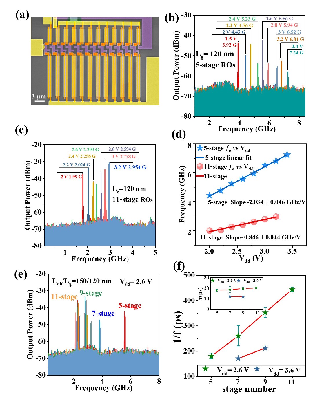 张志勇-彭练矛联合课题组通过系统的优化阵列碳纳米管沟道材料,改善MOS栅叠层结构(碳纳米管/栅介质/栅金属),实现了基于阵列碳纳米管的高性能增强型晶体管和集成电路,展现出碳管电子学的优势。制备的顶栅晶体管的载流子迁移率高达1850 cm2/V·s,是目前已报导的高密度碳纳米管阵列材料迁移率的最大值,接近化学气相沉积(CVD)生长的单根碳管迁移率,并且远超商用硅基空穴迁移率,充分展示了碳纳米管在高性能晶体管和电路应用中的潜力(见图1)。基于优化的栅叠层结构,200 nm栅长碳纳米管晶体管的室温下SS为73 mV/dec,峰值跨导和饱和电流分别达到1 mS/μm和1.18 mA/μm(见图2),在与相近尺寸的硅基晶体管和其他高性能碳管晶体管比较中,碳基晶体管在性能和功耗上表现出综合优势(见图3),实际性能超越相似尺寸的硅基晶体管。基于此高性能、均匀的增强型晶体管,批量制备出5、7、9、11阶环形振荡器,11阶环振产率高达80%,单阶门延时达到11.3ps,是目前基于纳米碳管和其他纳米材料制备的环振电路中的新纪录(见图4)。