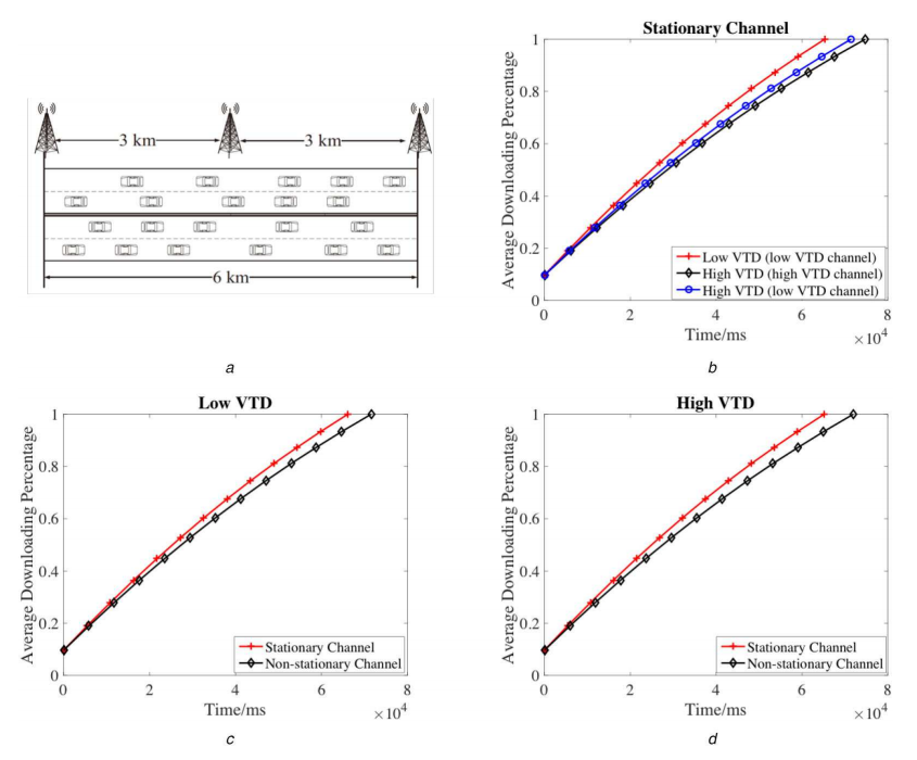 图2 信道非平稳特性和车流量密度对车联网系统上层的应用设计的影响:(a)仿真场景示意图,(b)不同车流量密度下的数据包平均下载百分比,(c)低车流量密度场景,平稳信道与非平稳信道下的数据包平均下载百分比,(d)高车流量密度场景,平稳信道与非平稳信道下的数据包平均下载百分比