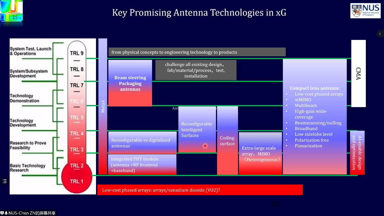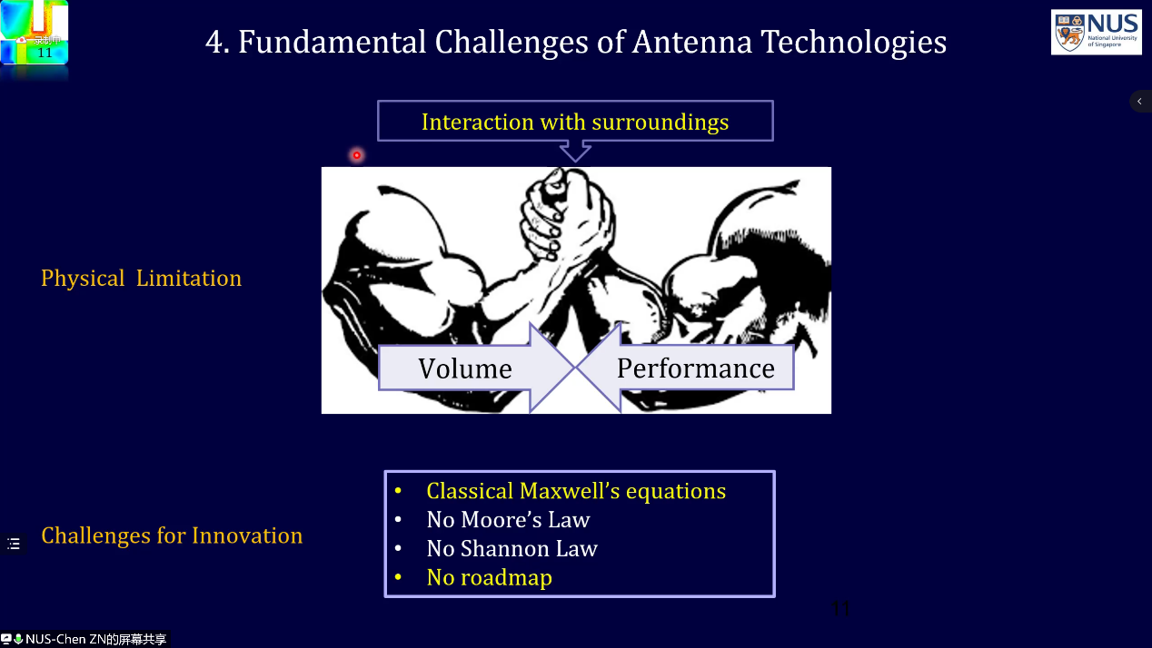 首先,陈志宁教授分享了对天线技术发展的现状、挑战及可能的研究方向的理解与思考。天线是无线系统中唯一用来实现电路电流与空间电磁波转换的器件,被广泛应用与移动通信、雷达和成像等领域。现有的天线技术所实现的性能指标几乎接近其物理极限。另一方面,由于天线技术的发展严格地受制于物理机理,特别是电尺寸与性能及功能之间的制约以及互偶影响,天线技术的发展与创新面临着巨大的挑战。