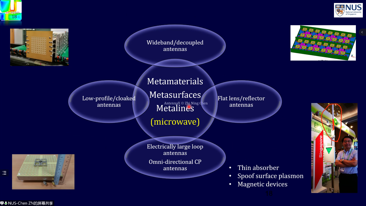 接着,陈教授以开发具有特殊性质的材料(metamaterials)对设计新型天线、增强天线性能以及增加功能起着根本性的影响作为例子,说明如何跨越物理概念到工程应用的鸿沟,以及源头创新对天线技术守正出新发展的重要性。对于数学方法的创新,陈教授介绍了特征模理论与分析在天线设计中的强大功能,展示将经典的数学工具应用到天线技术创新的重要影响。