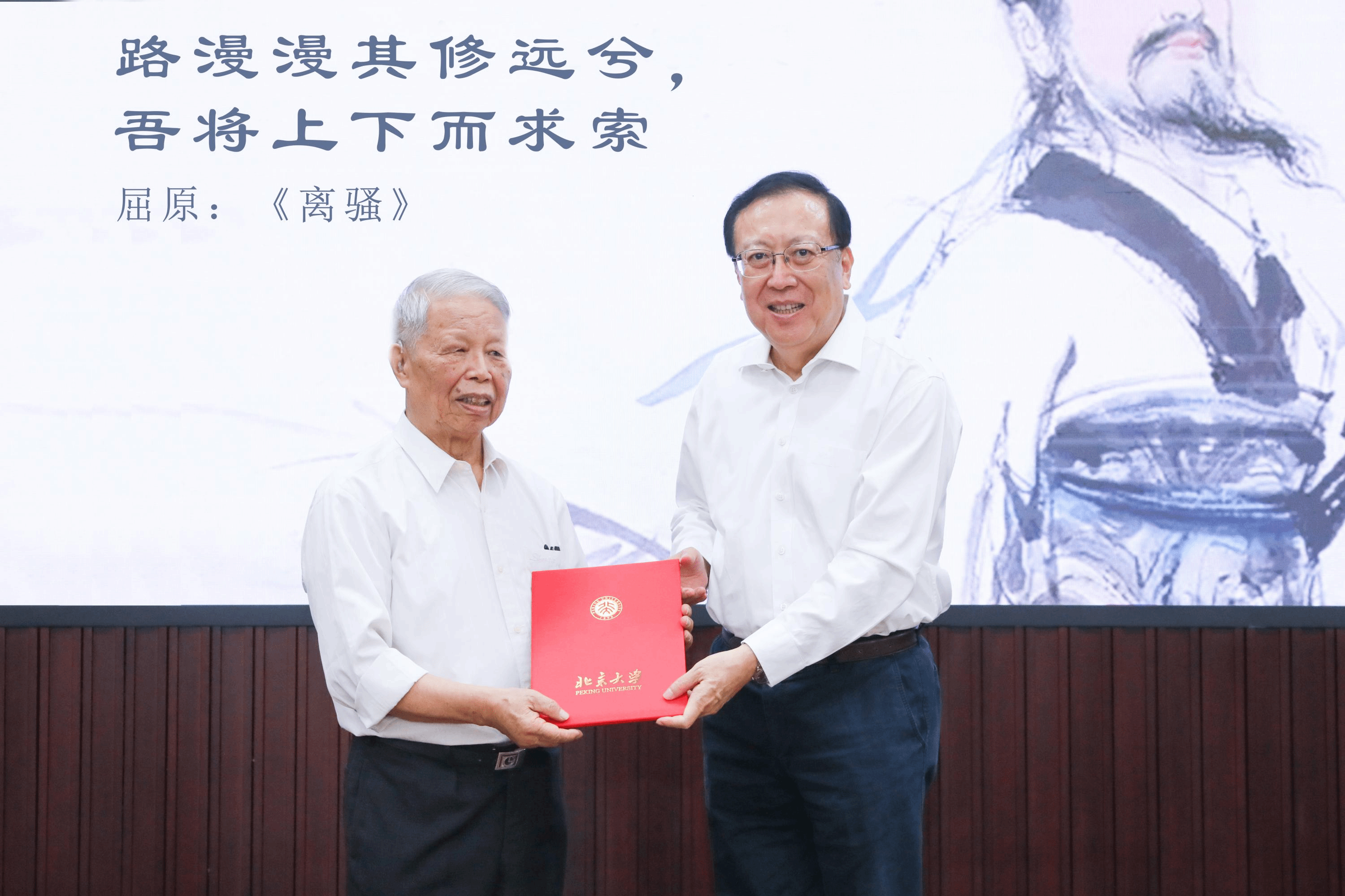 郝平为王义遒颁发感谢状,感谢他为科教事业和北大发展所作出的重要贡献