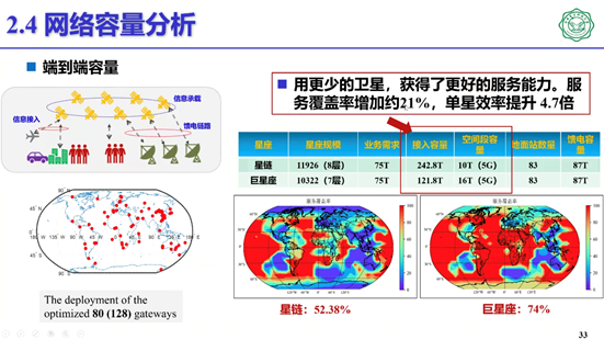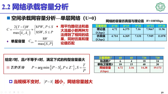 与星座构型的概念不同,星座拓扑构型是指由星间链路连接关系构成的拓扑结构,反映了星座中卫星之间信息传递的关系,与星座承载信息的能力息息相关。相同星座构型的网络可能会有不同的星座拓扑构型。盛教授向大家展示了拓扑构型分析、网络承载容量分析和网络接入容量分析的部分推导过程,以及得到的关键结论。在分析网络的端到端容量时,信息承载、信息接入以及馈电链路这三部分都需要考虑在内。通过对这三部分进行精密的设计,就能实现用更少的卫星获得更好的服务能力。