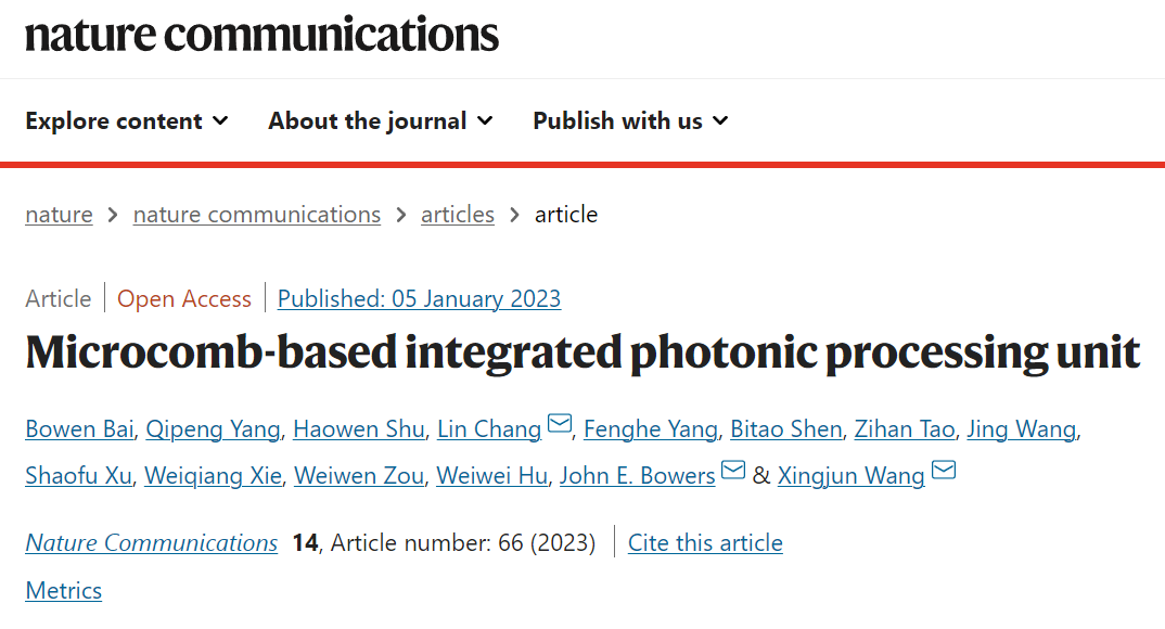 2023年1月5日,六合彩开奖号码 王兴军课题组-常林课题组在Nature Communications杂志在线发表文章“Microcomb-based integrated photonic processing unit”。文章首次报道了一种基于光子神经网络的超高算力密度硅基集成光子处理器。研究团队历时3年,攻克了多波长并行光计算系统校准和超高精度权重加载两个世界性技术难题。