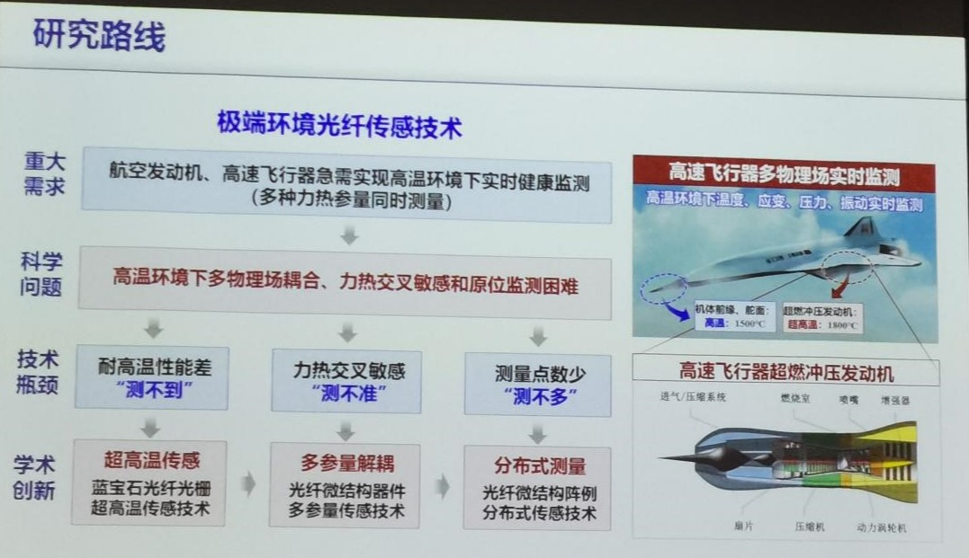 接下来介绍了极端环境中的光纤传感技术。在航空发动机、高速飞行器等系统中急需实现高温环境下实时监测(多种力热参量同时测量),为了解决高温环境下多物理场耦合、力热交叉敏感和原位监测困难,团队提出了一种基于蓝宝石光纤光栅超高温传感技术,在高温状态下可以连续稳定工作20小时,同时采用光纤微结构器件多参量传感技术实现多参量解耦以及分布式的光纤微结构阵列传感来增加提升测量精度。