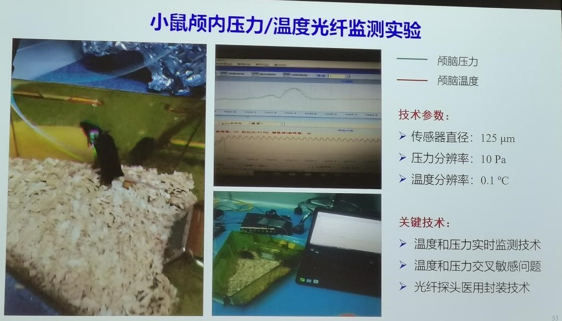 随后王教授介绍了面向生命健康的光纤传感技术。为了解决医疗中被国外垄断的脑压、脑温传感器问题,团队开展了一系列研究,如采用光纤探头实现小鼠颅内压力喝颅脑温度的实时监测,王教授指出其在医学上应用的关键技术是温度与压力的交叉敏感问题以及光纤探头的医用封装问题。
