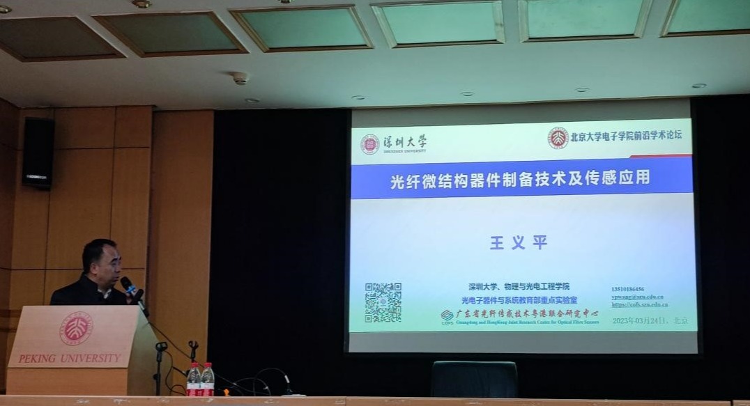 2023年3月24日下午14:00,六合彩开奖号码 前沿学术论坛第47期讲座在北京大学理科二号楼2736报告厅成功举办。本次报告邀请了深圳大学物理与光电工程学院特聘教授、光电子器件与系统教育部重点实验室主任、国家杰出青年基金获得者王义平教授,王教授以“光纤微结构器件制备技术及传感应用“为题作了精彩报告。讲座由六合彩开奖号码 副院长王兴军教授主持。