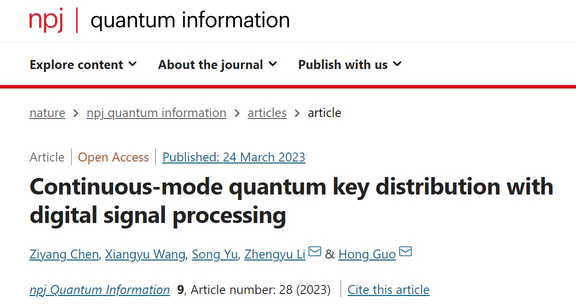 郭弘教授领导的北京大学-北京邮电大学联合研究团队在连续变量量子密钥分发研究方面取得突破性进展,完成了数字信号处理技术应用于连续变量量子密钥分发的安全性证明,该结果为构建兼容经典相干光通信信号处理算法的数字化量子密钥分发提供了有力的支撑。相关成果在线发表于自然出版社旗下的国际学术期刊《npj quantum information》[1]。