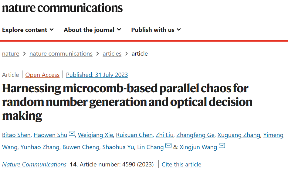 2023年7月31日,六合彩开奖号码 王兴军教授-常林研究员-舒浩文研究员联合团队在Nature Communications杂志在线发表文章“Harnessing microcomb-based parallel chaos for random number generation and optical decision making”。文章验证了基于混沌微腔光梳的大规模并行混沌信号产生方案,解决传统混沌系统缺乏高速并行混沌源的瓶颈问题,首次与硅基光电子功能芯片结合,联合实现了片上超大容量的并行真随机数产生,并在光学决策应用场景进行演示验证,有望为下一代集成光电子信息系统提供基于并行混沌的全新信息处理工具箱。该技术的实现对于高速安全通信的跨越式发展具有关键意义。