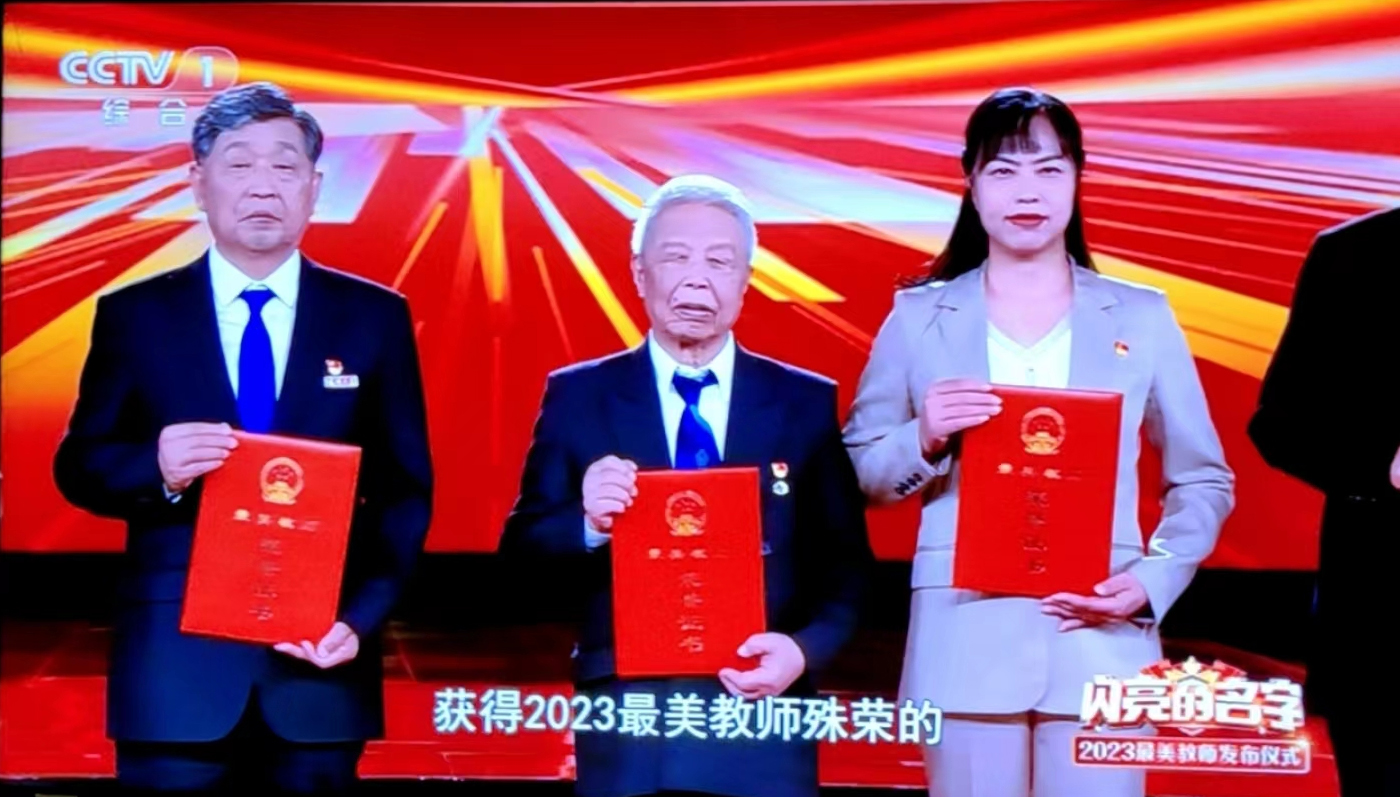 王义遒老师(中)在“2023最美教师”发布仪式上