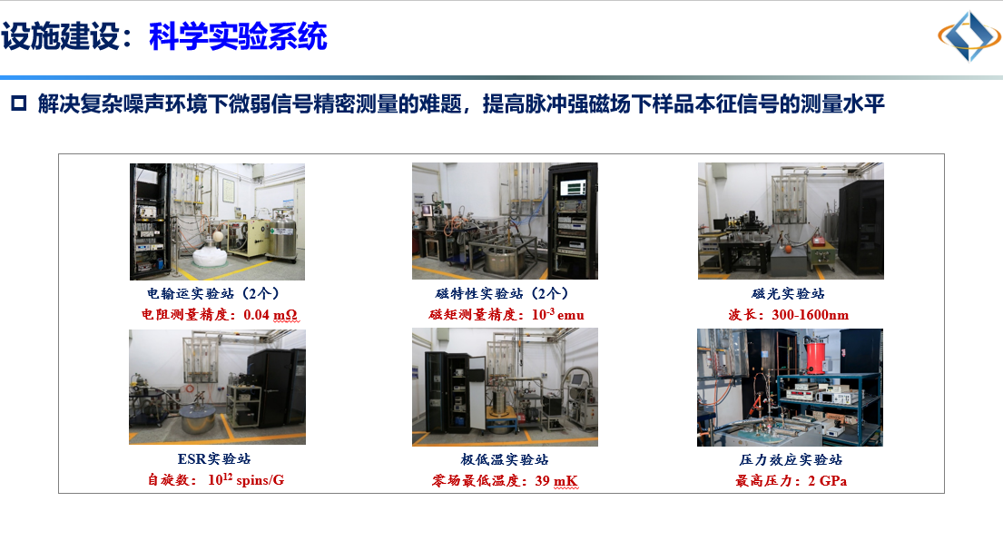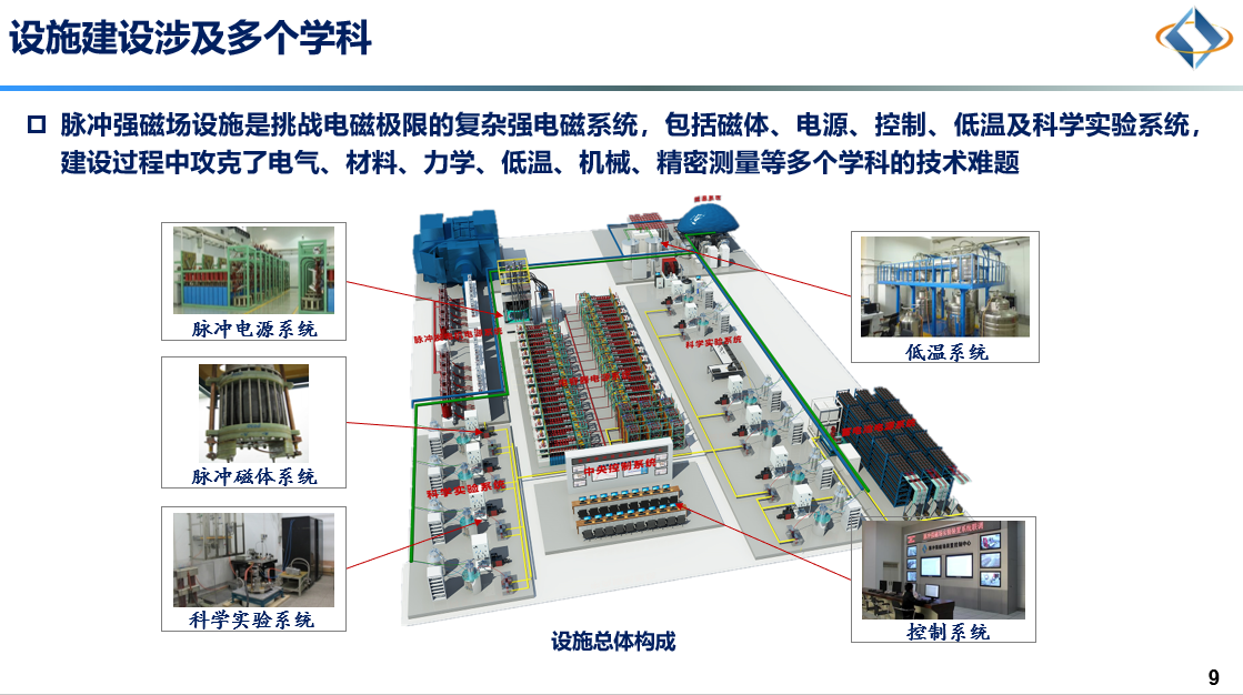 目前设施内的磁体系统解决了高参数脉冲磁体的力学稳定性问题,磁体性能和寿命得以大幅提升。在2020年已经实现了94.8T的磁场生成,正在向着100T的目标继续攻坚。电源系统包含有三组平行且各具特点的供电电源:高电压电容器储能电源易于产生短脉冲强磁场,机械能储能的脉冲发电机电源适合长脉冲,而化学储能的蓄电池组电源则更适合产生平顶脉冲强磁场。其余系统也各具特色,为最终实现具有强大功能的脉冲强磁场设施共同发力。