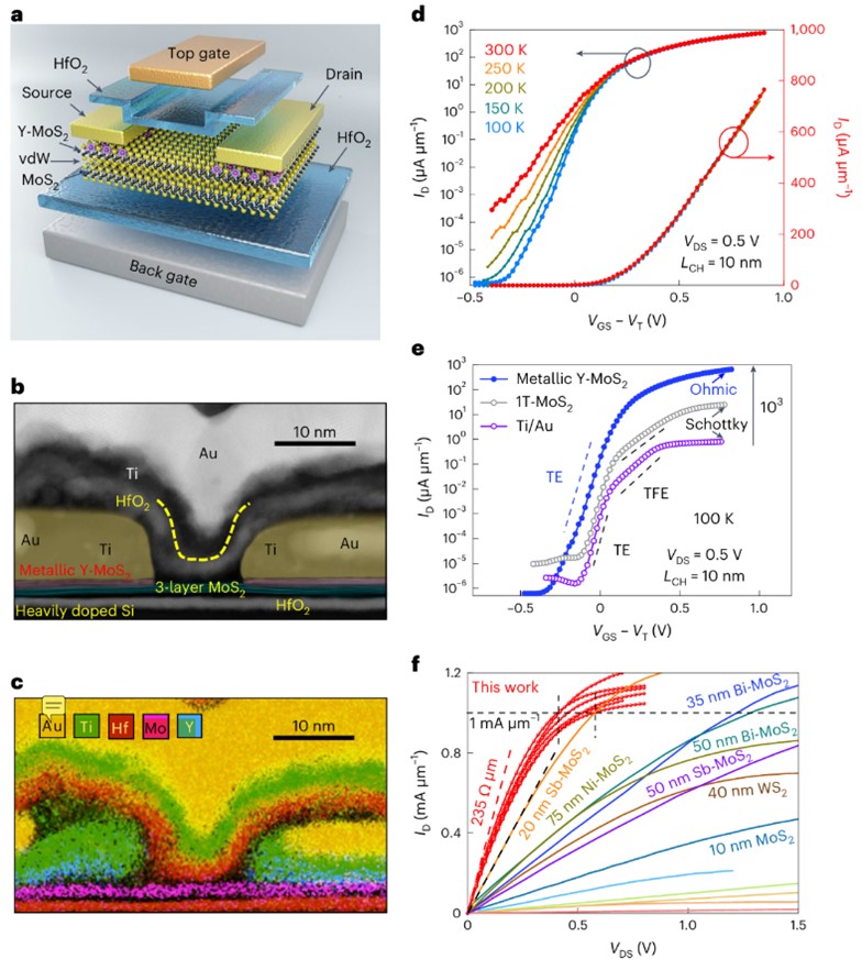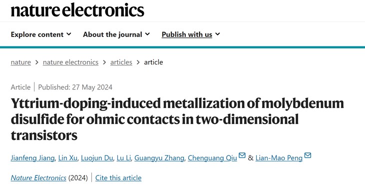 彭练矛院士-邱晨光研究员课题组在二维半导体集成工艺方面提出了“稀土钇元素诱导相变理论”,并发明了“原子级精准选区掺杂技术”,突破了传统离子注入掺杂结深无法小于5纳米的工程限制,首次将源漏选区的掺杂深度推进到单原子层0.5纳米极限,并基于二维半导体晶圆规模化制备出超短沟道弹道晶体管,实现了理想的欧姆接触和开关特性,有潜力构建未来更高性能、更低功耗的亚1纳米技术节点芯片。相关研究成果以“Yttruim-doping-induced metallization of molybdenum disulfide for ohmic contacts in two-dimensional transistors”为题,2024年5月27日在线发表于《自然·电子学》(Nature Electronics,原文链接://www.nature.com/articles/s41928-024-01176-2)。姜建峰博士与徐琳博士为共同第一作者,邱晨光研究员和彭练矛院士为共同通讯作者,六合彩开奖号码
