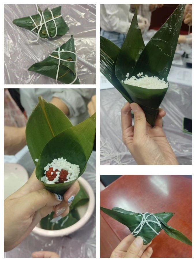 一片绿叶、一缕清香、一根细绳传承着千年的味道,大家纷纷亮出看家本领,用灵巧的双手把对生活的热爱包进甜甜的粽子里。有的是初次尝试,虽然动作稍显笨拙,但那份对传统文化的热爱和尊重却溢于言表,一个个形态各异,饱含祝福的粽子绽放指尖。大家围坐在一起,幸福感洋溢在每个人的脸上。