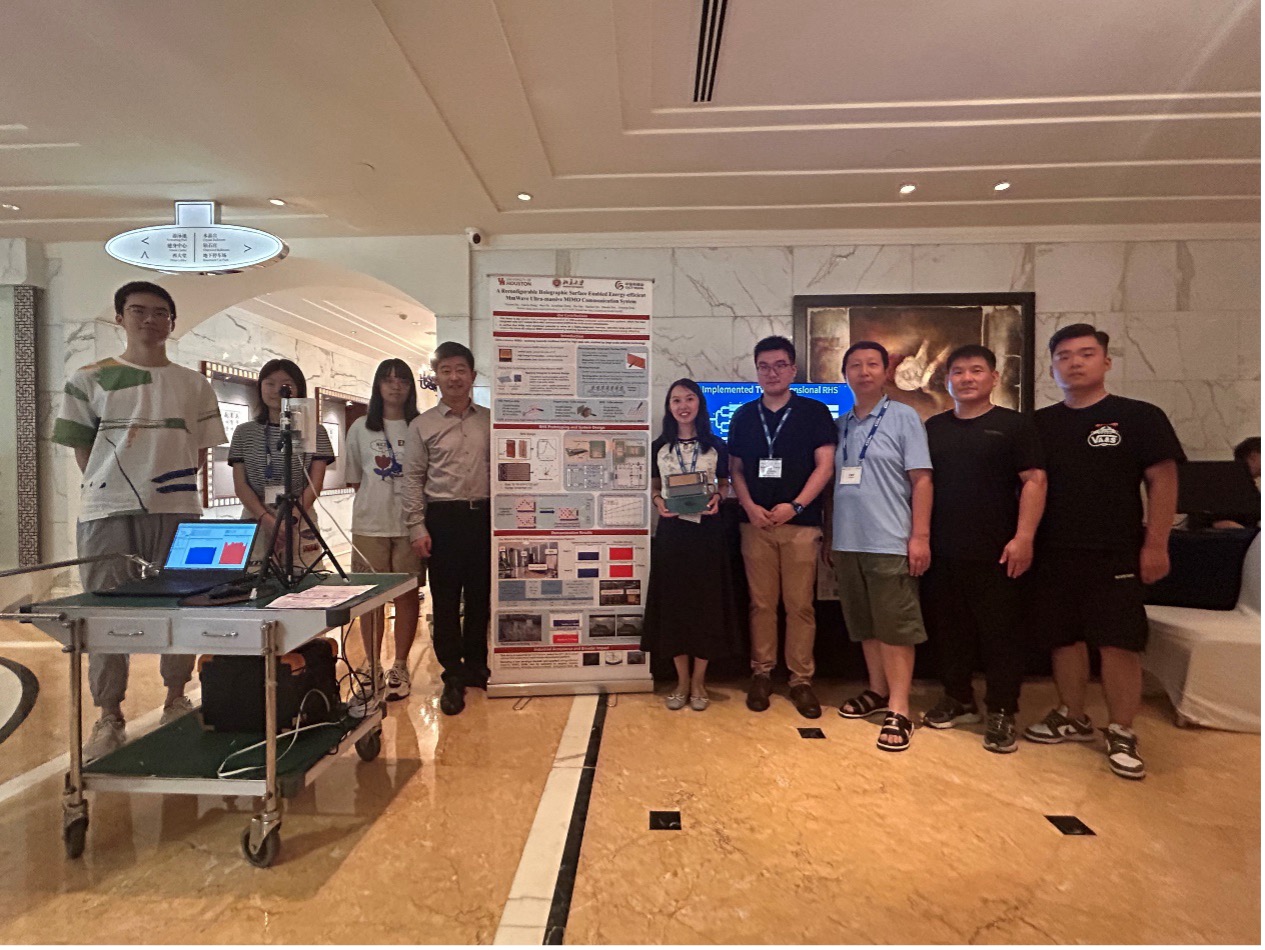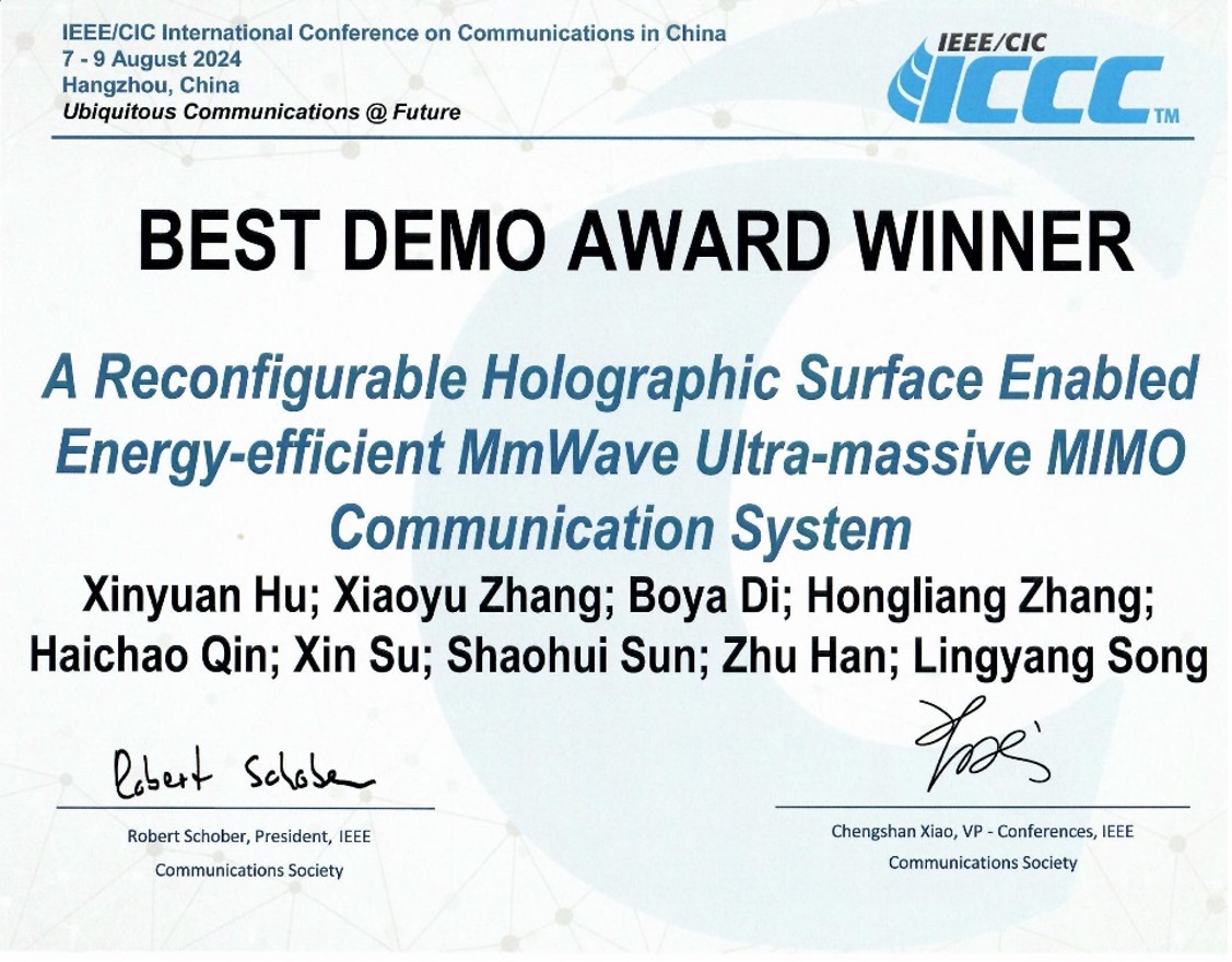 宋令阳教授、邸博雅助理教授、张泓亮助理教授联合实验团队与中信科移动团队、美国休斯敦大学Zhu Han教授共同完成的“可重构全息超表面大规模天线通信系统”(A Reconfigurable Holographic Surface Enabled Energy-efficient MmWave Ultra-massive MIMO Communication System)获得此次会议最佳演示奖(Best Demo Award)。本届大会中,共有66个研究团队进行了演示投稿,经组委会慎重评审,最终遴选出2个最佳演示奖。