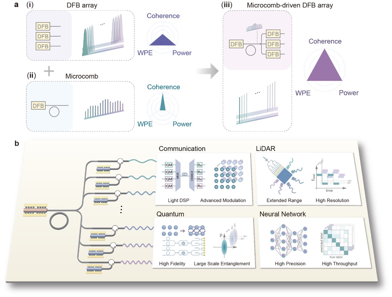 由于能够同时操控光的幅度和相位,相干光学在过去十几年中成为集成光学的重要发展趋势之一,为光通信、传感、量子信息等各种应用带来了无限的可能。然而,传统方案在集成光学中构建相干系统需要在硬件和功耗方面付出巨大的代价,其中一个核心难题是光源。迄今为止,还没有一种方法能同时实现高并行性、高相干性和高功率的集成光源。虽然III-V族DFB激光器因其优异的输出功率和电光转换效率(WPE)而被广泛使用,但其本征线宽通常在100 kHz水平,难以满足众多应用中的相干性要求。为了提高相干性,通常将III-V族激光器与高品质因子微腔结合,以有效降低线宽至1 kHz以下并产生光频梳。然而,这种方法牺牲了功率和每个通道的WPE。近年来发展的微腔光频梳技术可以实现单个器件的多波长产生,但其每个通道的功率通常低于-10 dBm。因此,系统中通常需要增益超过30 dB的放大,这对集成式掺铒光纤放大器和半导体光放大器提出了挑战,并且这两种方法都会不可避免地引入额外的噪声。
