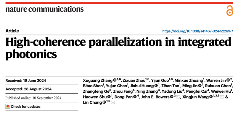 常林研究员团队与王兴军教授团队和合作者在Nature Communications杂志在线发表了题为“High-coherence parallelization in integrated photonics”的研究文章。该研究展示了一种新型低成本、高相干的集成并行源产生方案。通过结合自注入锁定光频梳和注入锁定激光器阵列,实现了在近零噪声系数下创纪录的片上60 dB增益。此外,通过将这一技术与硅光相干光模块结合,实现了超过60 Tbit/s的总传输速率,并将相位相关的数字信号处理(DSP)开销降低了99.99999%。这项研究为实现大规模、高性能、大容量的相干光系统铺平了道路,有望解决由于流量需求爆炸式增长带来的芯片间和数据中心间互联问题,为未来光通信网络的发展带来了新的希望。
