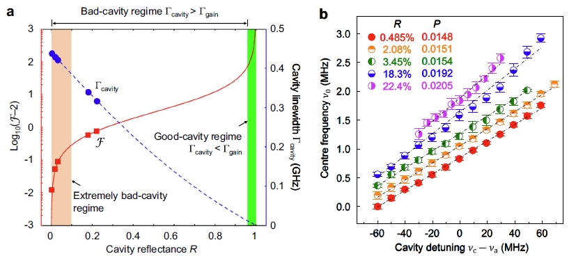 在这项研究中,激光器腔精度接近于最低极限值2。利用如此低精细的谐振腔实现激光,并研究其物理原理和机制,证明其在量子精度测量中的独特优势,之前从未被报道过。该工作利用7.17 MHz的增益线宽,实现了1.2 kHz的窄线宽激光输出,实现了优于原子跃迁自然线宽3个量级的线宽压窄效果。实验上得到腔牵引系数为0.0148,是目前连续波主动光钟激光器的最低值。极坏腔激光的新概念不同于传统激光,这一研究成果为实现主动光钟超窄线宽激光提供了新的技术途径,有望开启量子物理的一个全新研究领域。