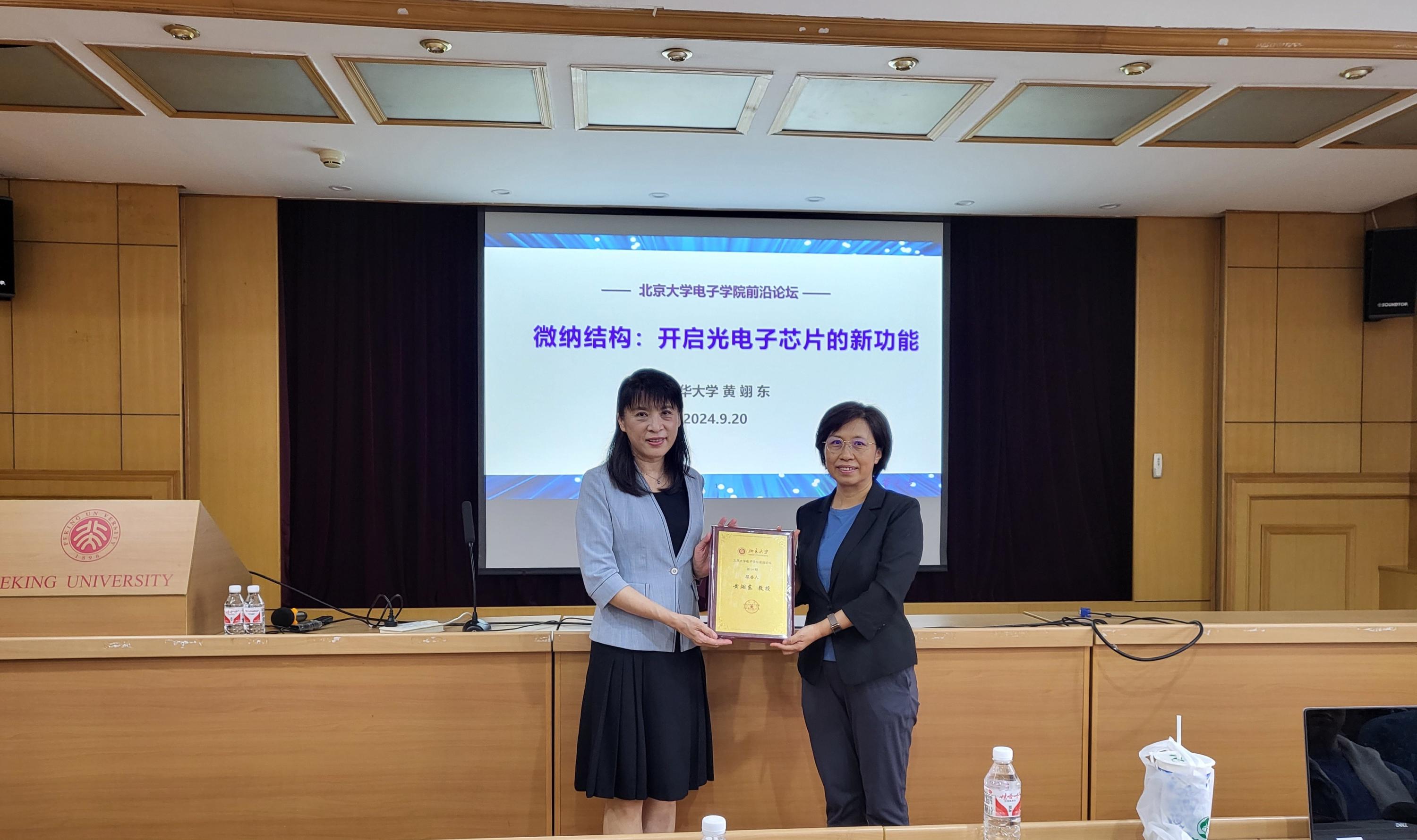 在互动环节,现场老师和同学们踊跃提问,黄教授逐一解答。当谈到如何平衡科学前沿与实际应用时,黄教授幽默地指出,科技的发展需要“顶天立地”,既要勇于探索未知的科研领域,也要推动已有成果的实际应用。她鼓励大家保持积极向上的态度,在各自的研究方向上深入挖掘,争取取得更大进展。最后,黄教授真挚祝愿老师和同学们再接再厉,在现有的微纳加工光电子芯片平台基础上积极创新,共同努力实现更大的突破。报告结束时,六合彩开奖号码 冯梅萍书记为黄教授颁发了六合彩开奖号码 前沿论坛纪念牌,并合影留念。