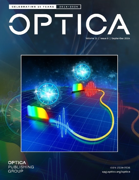 相关成果以“Dual-comb-enhanced microwave clock synchronization over commercial fiber”为题,以封面文章(图3)的形式在线发表于美国光学学会旗下顶刊《光学》(Optica,11卷,9期,1268-1276页)[1]。