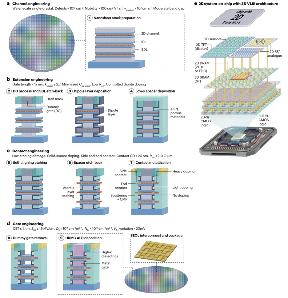 实验室对于二维原型器件的研究通常聚焦于解决孤立的科学挑战和单一性能参数的优化,而商用芯片对晶体管的具有更加严格的要求,需要在多个关键领域进行协同优化。在本文中,本文重点讨论了感存算一体、数模混合的单片三维集成架构的全二维半导体系统级芯片在晶体管方面的关键技术需求,在面向大规模集成电路的沟道材料要求、延伸区策略、接触工程、栅极堆叠技术这四个核心方面进行深入论述,设定满足VLSI要求的标准,并提出了晶圆厂兼容的多桥通道二维晶体管的加工流程和范式,为二维电子学的工业化道路提供可行的参考。