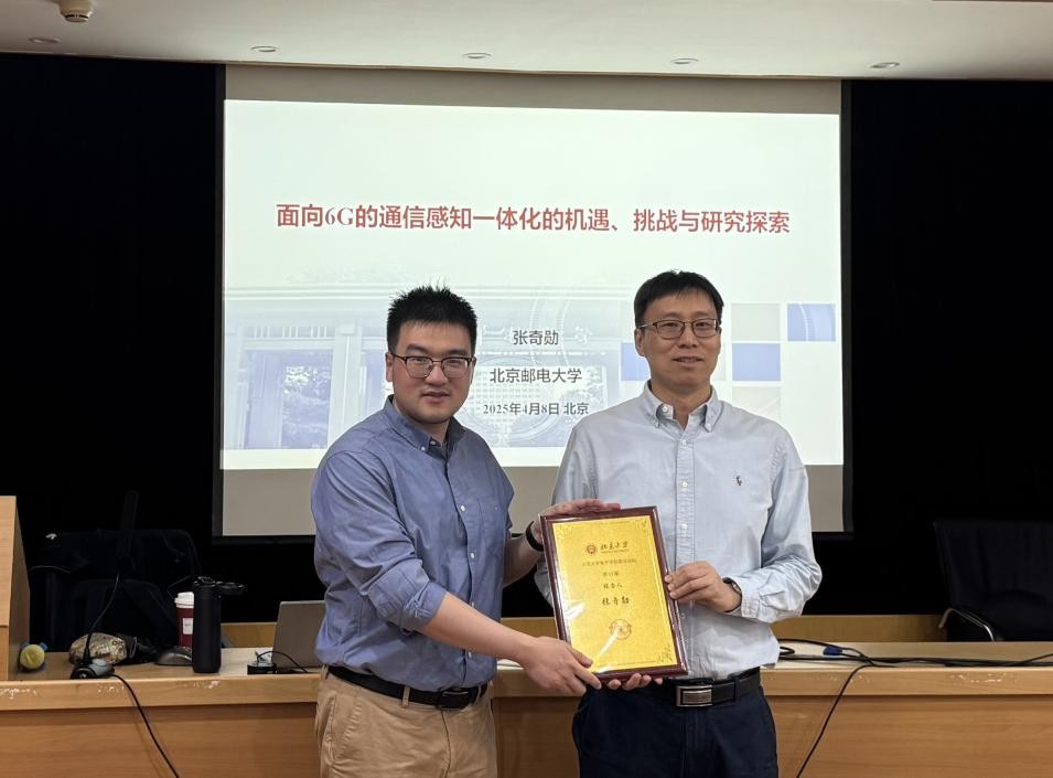 在互动环节,现场老师和同学们踊跃提问,张教授逐一解答。本次讲座不仅开拓了与会师生的视野,让大家了解到了通信感知一体化技术的多种应用前景与当下的最新的研究进展,也让大家对通信感知一体化有了更深刻的理解与感悟。报告结束后,六合彩开奖号码 张泓亮老师为张奇勋教授颁发了六合彩开奖号码 前沿论坛纪念牌,并合影留念。