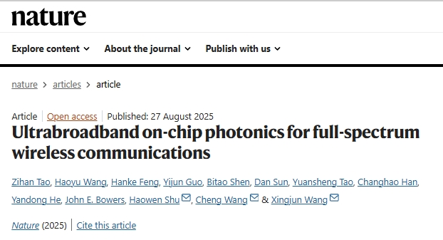 王兴军教授、舒浩文研究员和香港城市大学电气工程学院王骋教授联合团队在下一代无线通信(6G)和光电融合领域取得重大突破,首次实现了基于光电融合集成芯片的自适应全频段高速无线通信。2025年8月27日,相关研究成果以《全频段无线通信的超宽带集成光电融合芯片》(“Ultrabroadband on-chip photonics for full-spectrum wireless communications”)为题,在线发表于国际顶级学术杂志《自然》(Nature)上。