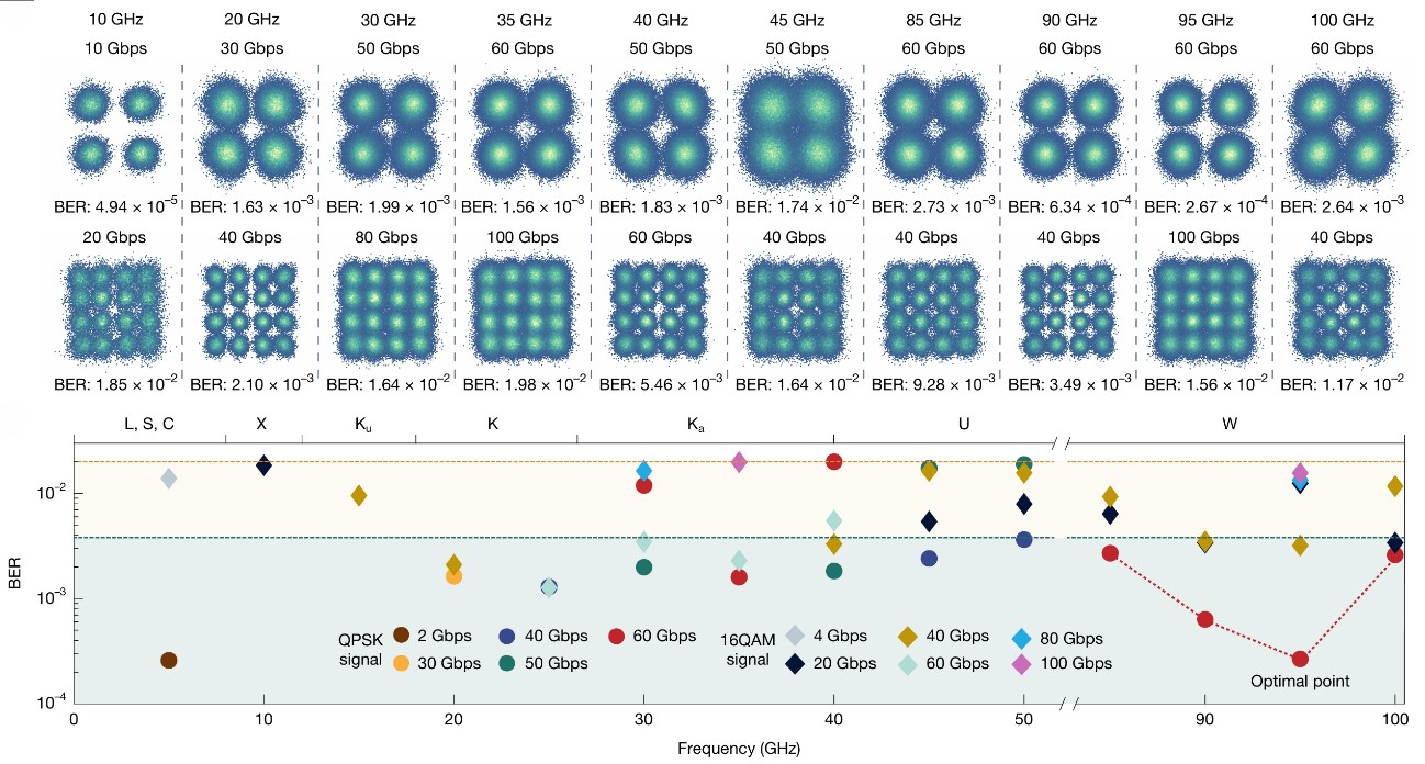 实验验证表明,该系统可实现>120Gbps 的超高速无线传输速率,满足6G通信的峰值速率要求。尤为关键的是,得益于光电融合集成芯片的超宽带特性,端到端无线通信链路在全频段内展现出卓越的性能一致性(图2),且高频段性能未见劣化。这一突破性成果为6G通信高效开发太赫兹及乃至更高频段的频谱资源扫清了关键障碍。进一步,得益于光电融合集成电路的可调谐特性,该系统支持工作频率的实时重构。即使在信道受噪声干扰或多径效应等被动影响而劣化时,仍能通过动态切换至安全频段确保通信可靠性。