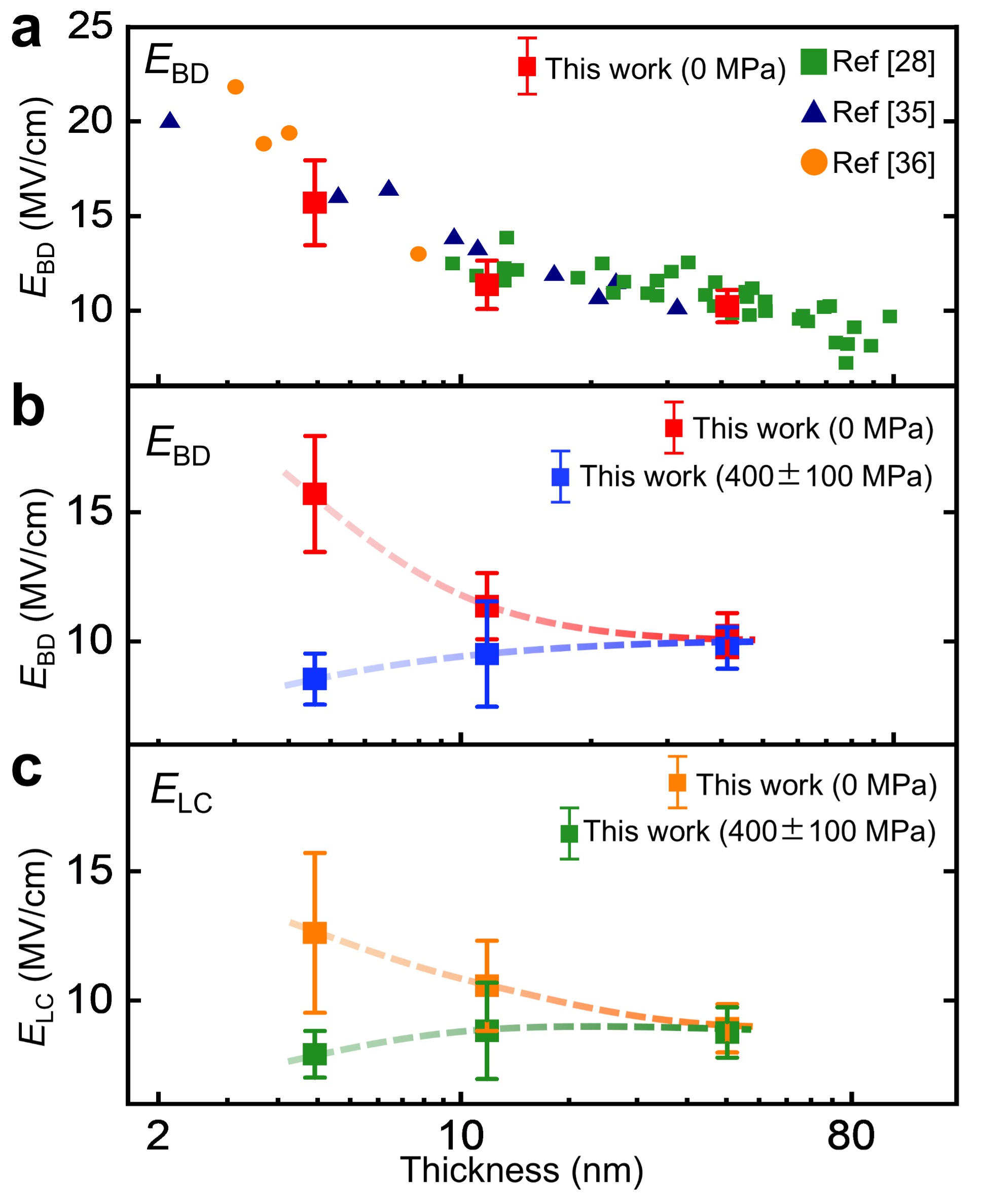 图1 不同应力情况下不同厚度二维hBN的本征击穿电场强度(EBD)和出现显著漏电流的电场强度(ELC