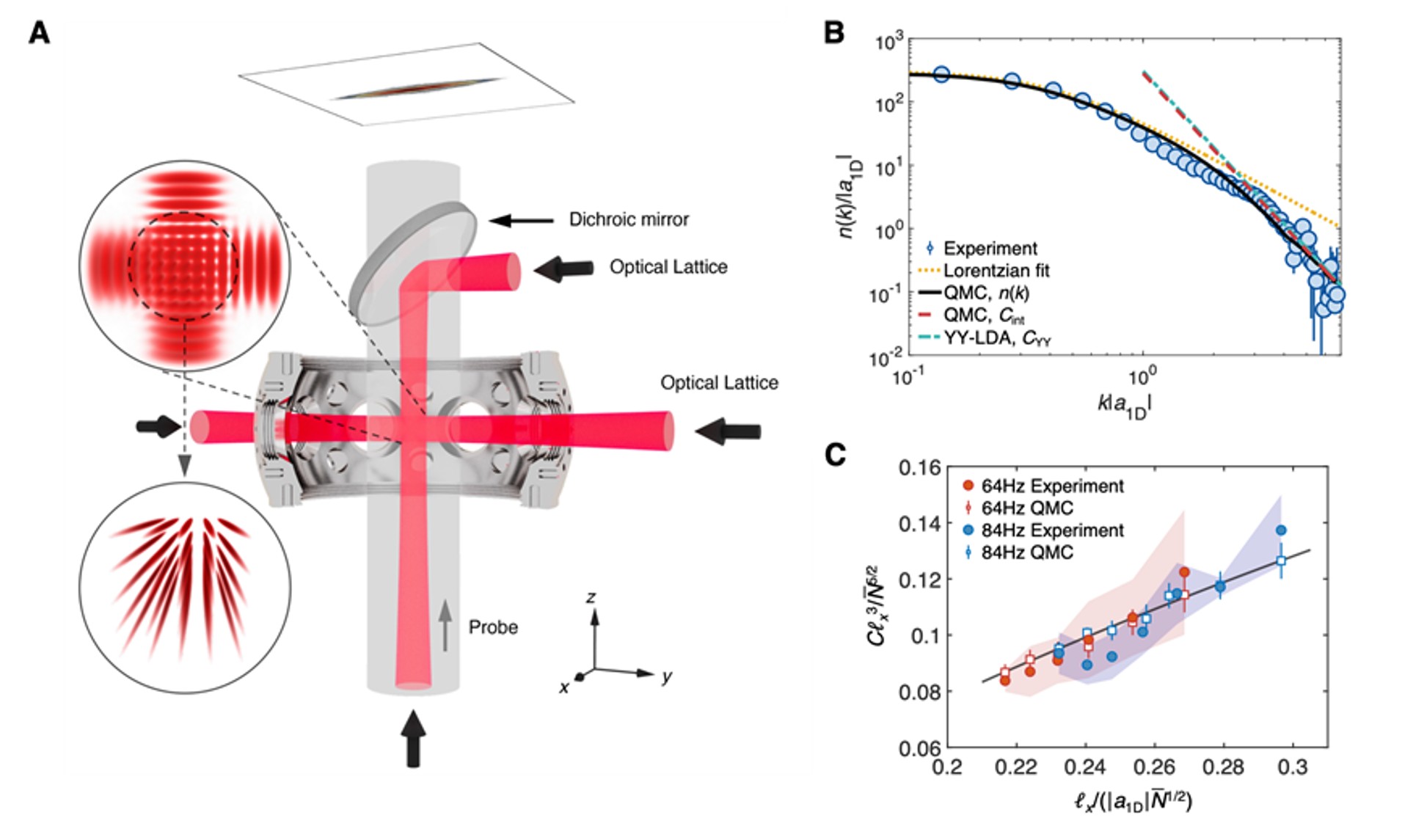 相互作用在决定多体体系的物理行为方面起着至关重要的作用。其中,檀接触量(Tan’s contact)是描述多体体系中两体接触相互作用的重要特征量,它能够描述大多数凝聚态多体系统的主要特征,并且严格适用于绝大多数超冷原子气体。最近,北京大学陈徐宗、姚和朋课题组与法国巴黎综合理工学院Laurent Sanchez-Palencia教授合作,利用一维强相互作用的玻色超冷原子系统,实现了首个对超冷玻色气动量分布中普适 1/k⁴ 尾迹(即高动量分布)的直接观测,并通过其权重直接测量了檀接触量。相关成果以《在一维李布-林尼格气体中直接测量檀接触量》(Direct measurement of Tan’s contact in a one-dimensional Lieb-Liniger gas)为题,于2025年10月3日在线发表于《科学·进展》(Science Advances)上。