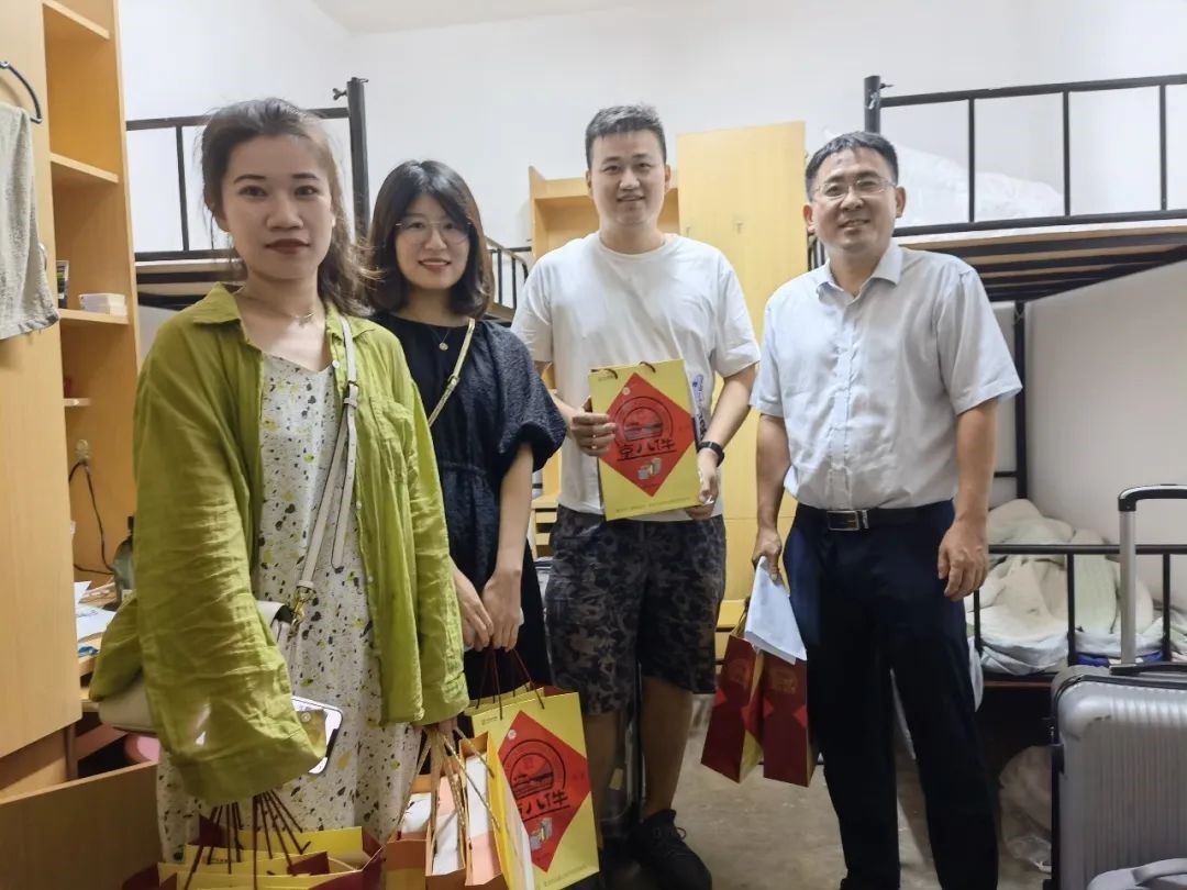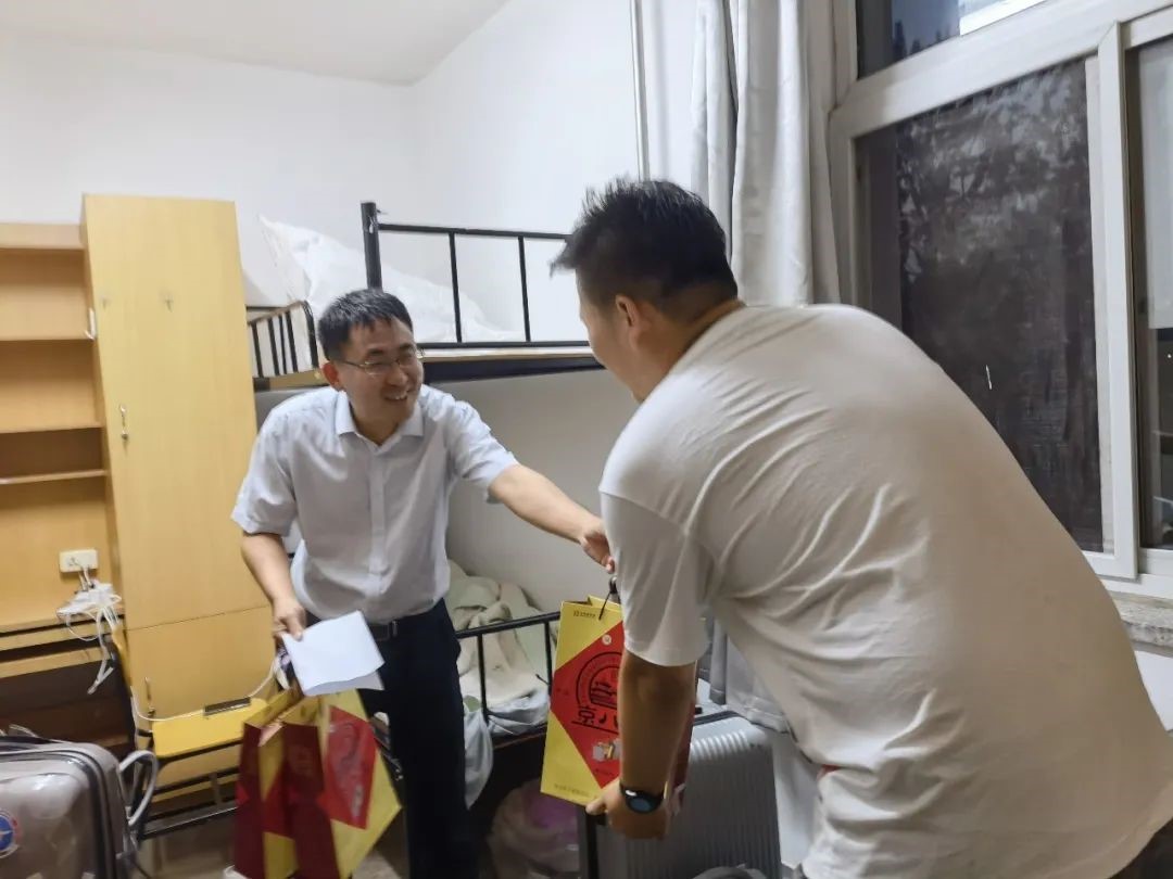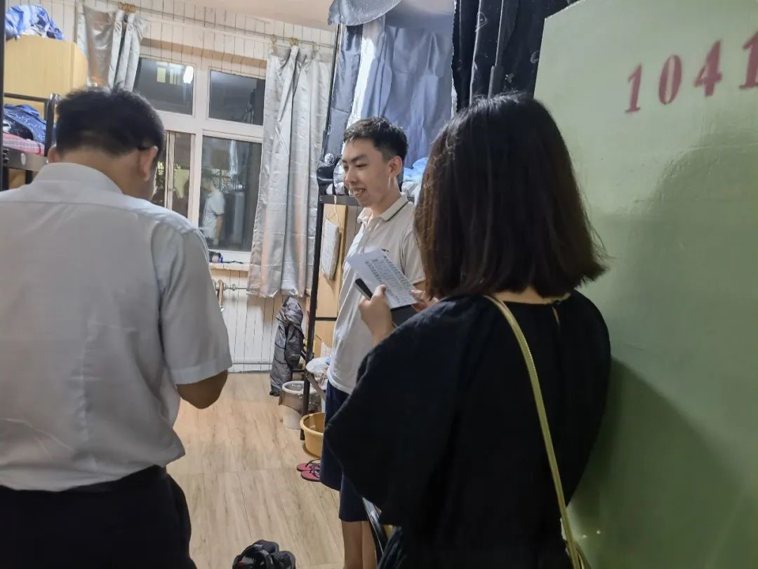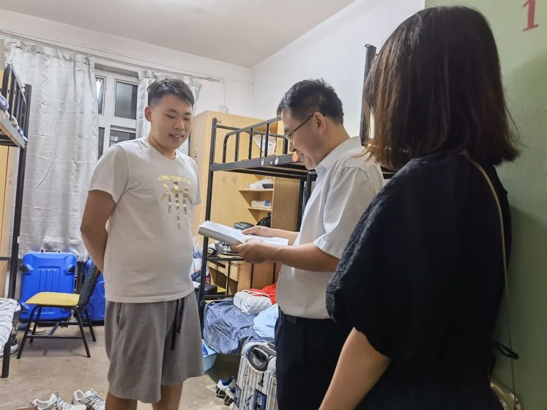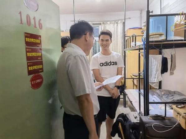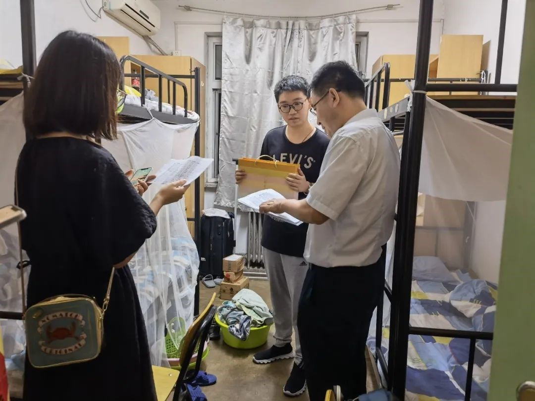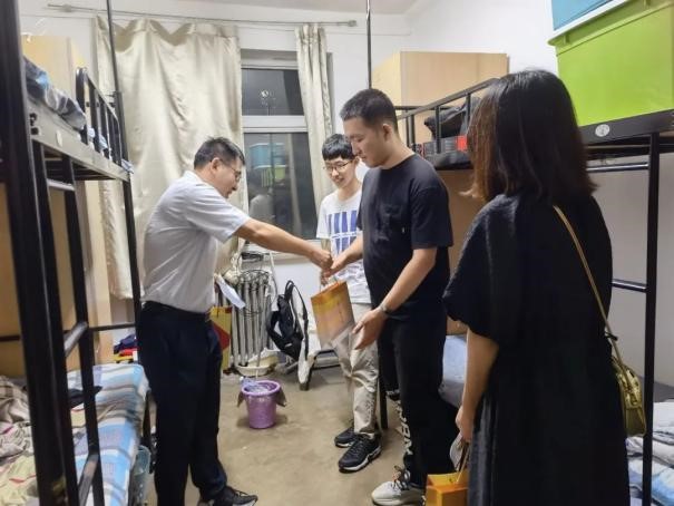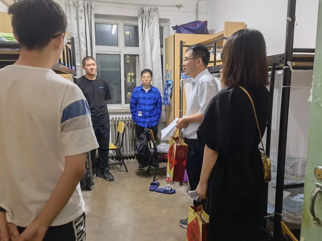 2021年9月7日晚,电子学系副主任王兴军、电子学系团总支书记商小琦、团总支学生骨干一起慰问走访2021级新生宿舍。