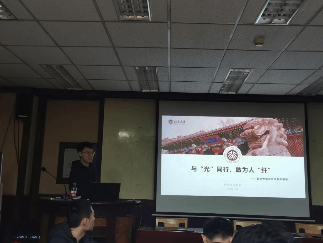 光纤班本学期获评“北京大学示范班集体”的荣誉,光纤班班长陈彦钧同学向各位骨干分享了以“与‘光’同行,敢为人‘纤’”为主题的班级建设经验:一方面要保证“上传下达”以及日常班级管理的效率,打牢班级建设的基石;另一方面要充分发挥班内组织和班级骨干的作用,立足研究生纵向班的特点,开展以课题组、同年级、同实验室、同寝室及全体性的各类活动,为大家提供更多的交流平台。还要主动发挥研究生班级的特色和优势,把科研融入集体活动,让党团支部激发带动班级活力。