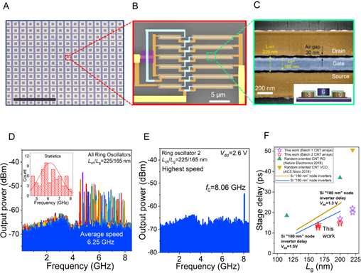 北京大学信息科学技术学院电子学系/北京大学碳基电子学研究中心、纳米器件物理与化学教育部重点实验室张志勇教授-彭练矛教授课题组发展全新的提纯和自组装方法,制备高密度高纯半导体阵列碳纳米管材料,并在此基础上首次实现了性能超越同等栅长硅基CMOS技术的晶体管和电路,展现出碳管电子学的优势。该课题组采用多次聚合物分散和提纯技术得到超高纯度碳管溶液,并结合维度限制自排列法,在4英寸基底上制备出密度为120 /μm、半导体纯度高达99.99995%、直径分布在1.45±0.23 nm的碳管阵列(见图二),从而达到超大规模碳管集成电路的需求。基于这种材料,批量制备出场效应晶体管和环形振荡器电路,100 nm栅长碳管晶体管的峰值跨导和饱和电流分别达到0.9 mS/μm和1.3 mA/μm(VDD=1 V,见图3),室温下亚阈值摆幅为90 mV/DEC;批量制备出五阶环形振荡器电路,成品率超过50%,最高振荡频率8.06 GHz远超已发表的基于纳米材料的电路(见图4),且超越相似尺寸的硅基CMOS器件和电路。