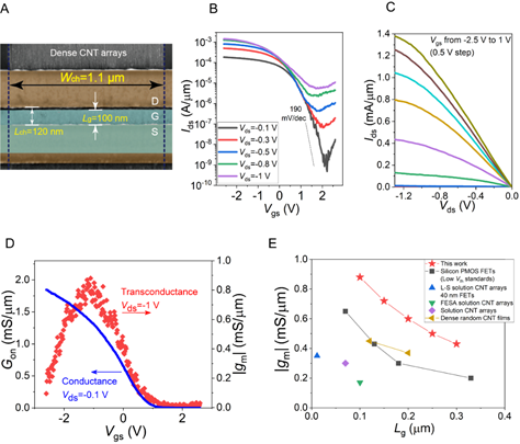 集成电路的发展要求互补金属氧化物半导体(CMOS)晶体管在持续缩减尺寸的同时提升性能,降低功耗。随着主流CMOS集成电路缩减到亚10 nm技术节点,采用新结构或新材料对抗场效应晶体管中的短沟道效应、进一步提升器件能量利用效率变得愈加重要。在诸多新型半导体材料中,半导体碳纳米管具有超高的电子和空穴迁移率、原子尺度的厚度和稳定的结构,是构建高性能CMOS器件的理想沟道材料。已公开的理论计算和实验结果均表明,碳管CMOS晶体管采用平面结构即可缩减到5 nm栅长,且较同等栅长的硅基CMOS器件具有10倍的本征性能-功耗综合优势。