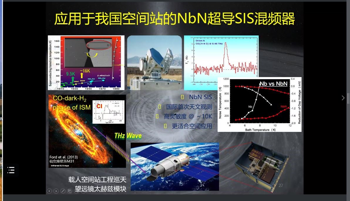 史院士带我们回顾了超导探测器的发展历程,深入介绍了超导隧道结SIS在高性能混频器中应用的原理,并详细总结了已经产出的一系列突出成果。1998年成功研制并运行我国首台超导接收机将望远镜灵敏度提升了一个量级,所研制的高灵敏度NbN超导隧道结混频器进一步应用于我国空间站巡天望远镜,属国际首次。随后,史院士分享了紫金山天文台在太赫兹超导HEB热电子混频器领域的最新研究进展,具体为2019年在国际上率先实现中红外谱段超导HEB/QCL接收机。