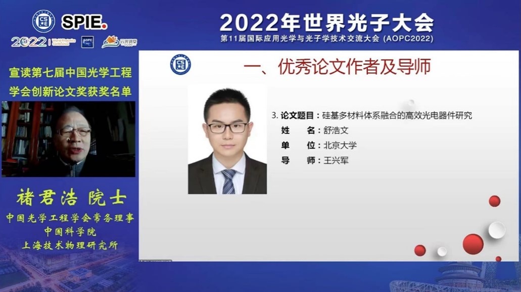 王兴军教授指导的博士学位论文《硅基多材料体系融合的高效光电器件研究》获得创新论文奖,论文作者为2020届博士毕业生舒浩文。