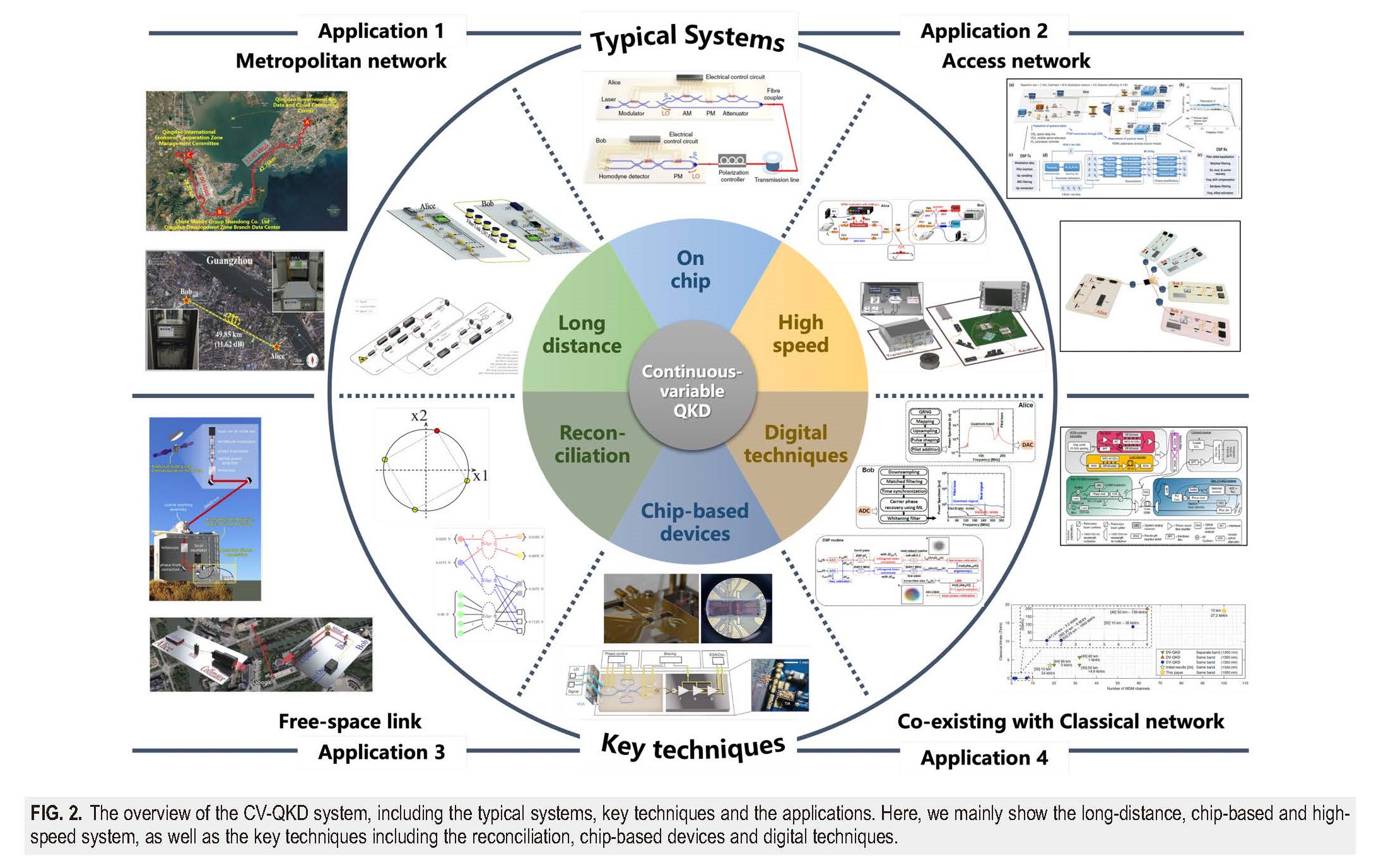 郭弘教授领导的北京大学—北京邮电大学联合研究团队应邀在囯际物理学综述期刊、美国物理联合会(American Institute of Physics, AIP)旗下的《应用物理评论》(Applied Physics Reviews)杂志发表题为《连续变量量子密钥分发系统:过去、现在和未来》(Continuous-variable quantum key distribution system: past, present, and future)的长篇综述论文。该论文总结了连续变量量子密钥分发系统的发展历程,介绍了当前最先进的系统化技术并对未来该领域的发展趋势进行了展望。论文指出,当前连续变量量子密钥分发系统在城域和接入距离内的高性能、高兼容性优点已经得到了验证,未来将会进一步向高集成度、高速率和远距离方向发展,赋能大规模量子密钥分发网络。