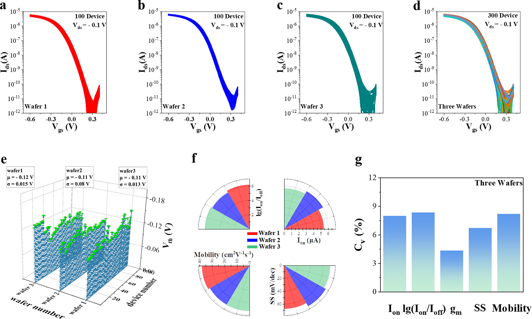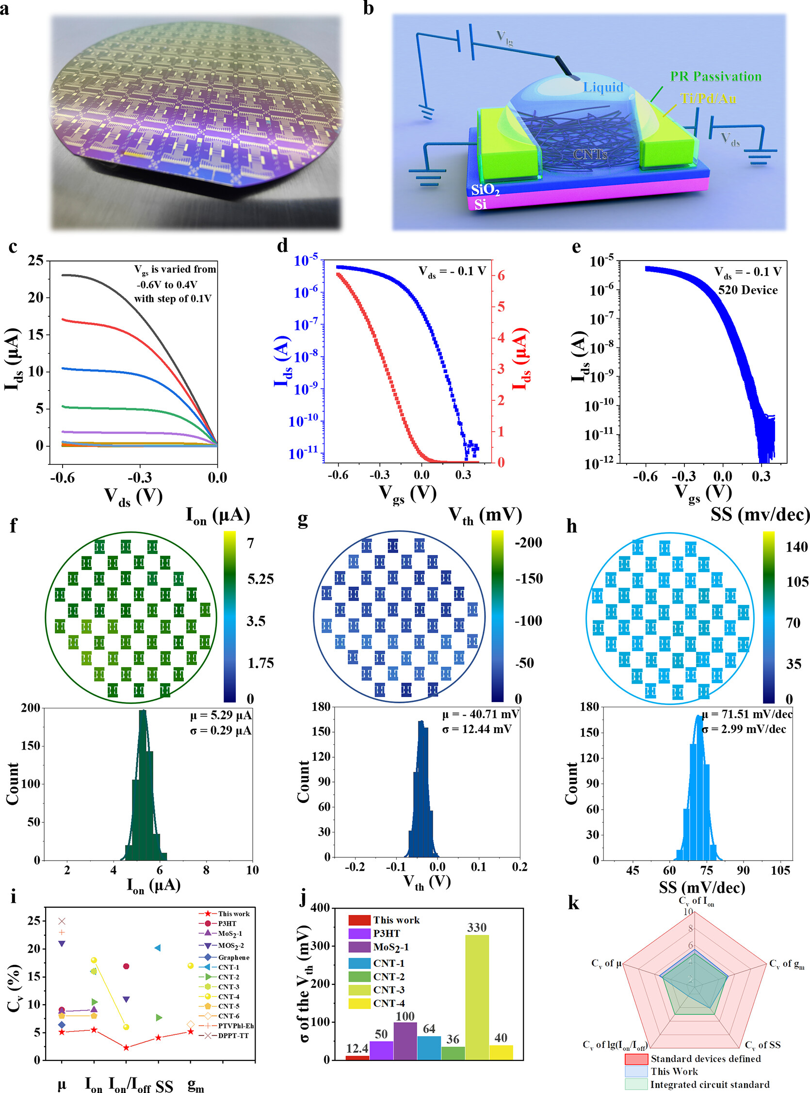 在器件制备上,通过优化CNT FET生物传感器的制备工艺,实现了4英寸晶圆碳基FET批量制备,并大幅度提升了器件均匀性,晶圆内器件性能变化系数优于6%,晶圆间器件性能变化系数在9%以内(图2、图3)。