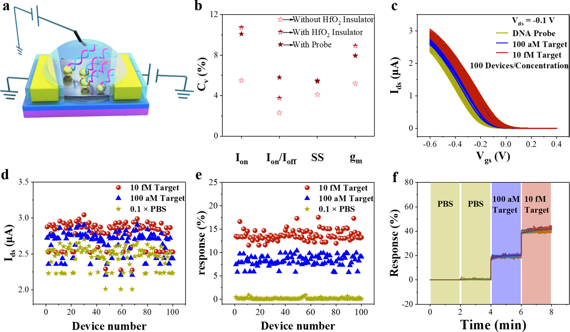 在此基础上,课题组发展了CNT FET生物传感器划片、封装的标准工艺流程,并专门开发了用于FET生物传感器信号读出的专用便携式设备,可实现生物传感芯片的即插即用,操作界面友好,非专业人员亦可根据简单的说明书实现生物目标的探测。课题组还展示了通过该便携式高效检测系统,优化检测方式和数据处理方式,CNT FET生物传感器可在空白背景下检测浓度低至100 aM的生物信号(图5)。