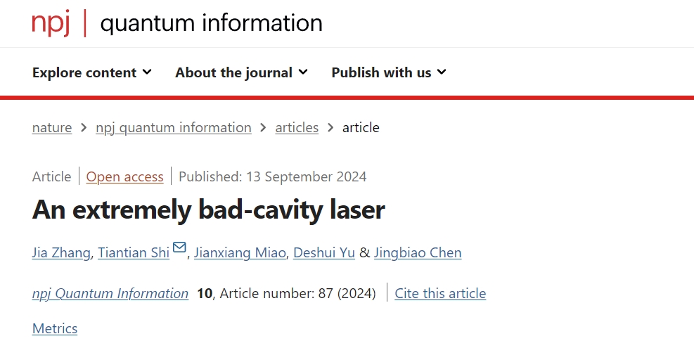 陈景标教授团队在新型激光领域研究方面取得突破性进展,成功利用精细度达最低极限值2的光学谐振腔实现了线宽在kHz量级的极坏腔主动光钟激光,该结果刷新了国际同行对光学谐振腔应用的认知,为实现窄线宽激光提供了反直观的技术途径。相关研究成果以“An extremely bad-cavity laser”为题,发表于自然出版社旗下的国际学术期刊《npj quantum information》。