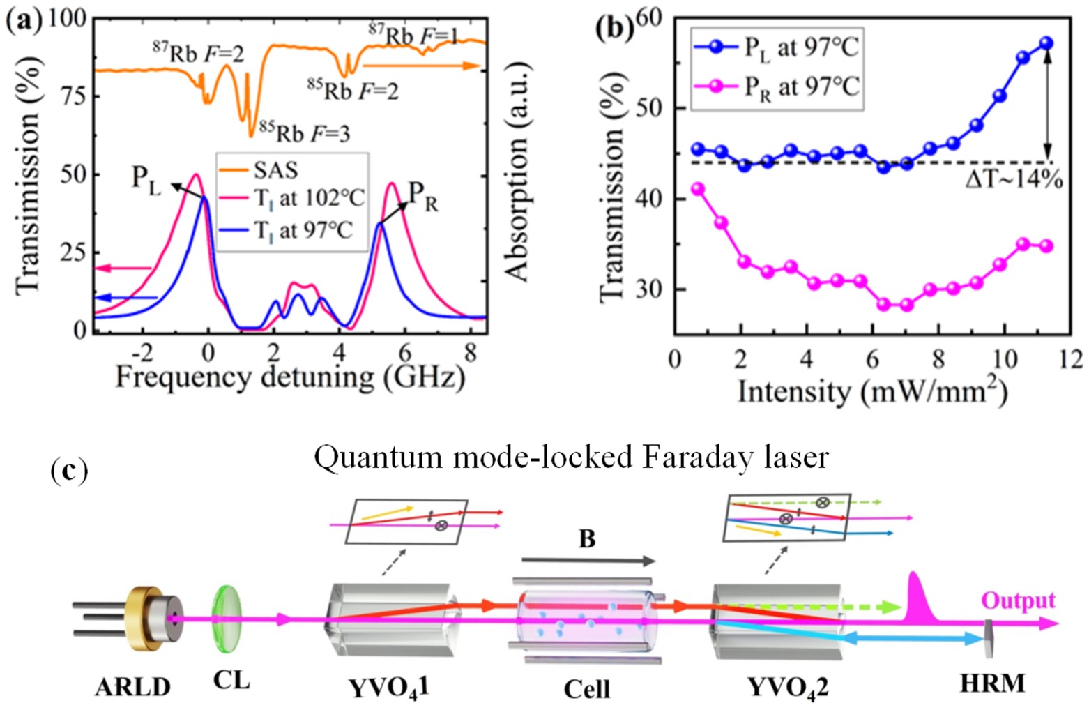 陈景标教授课题组利用法拉第原子滤光器的量子特性,即原子滤光器只对与原子量子跃迁频率共振的光具有的窄带透射特性和可饱和吸收特性,在法拉第激光器中获得了一种光谱宽度在GHz量级,透射中心波长对应原子跃迁频率的量子锁模脉冲。