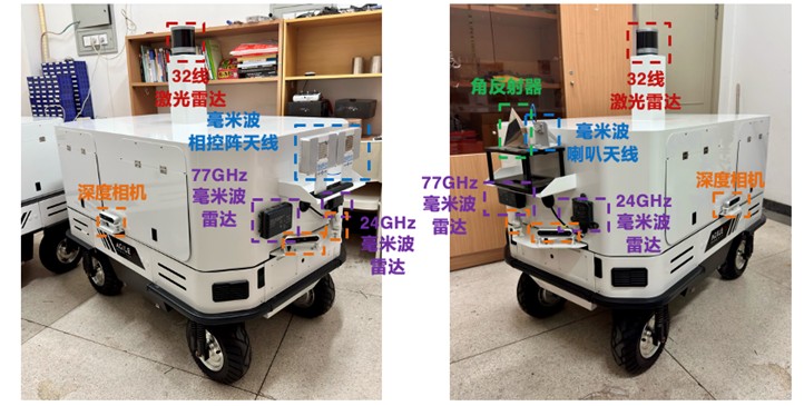 受脑神经网络作用下一种感官自动唤醒另一种感官的人类联觉现象启发,程翔教授团队在全球首次提出并系统论述了“机器联觉(Synesthesia of Machines,SoM)”架构和概念,即面向通用任务的AI原生通信与多模态感知智能融合,利用大模型/无线基座模型,突破多模态通感融合的核心技术,攻克多模态数据集构建难、多模态通感智能融合难等挑战,通过“机理-硬件-算法”创新,提供网联智能发展新路径。作为支撑机器联觉研究与算法部署验证的硬件基础,团队已搭建如图2所示的面向网联具身智能体的机器联觉系统。该系统利用四驱全向自主移动机器人(Autonomous Mobile Robot,AMR)作为网联具身智能体,搭载包括软件定义无线电设备、相控阵天线、多线激光雷达、RGB-D相机、77GHz/24GHz毫米波雷达在内的通信设备与多模态传感器作为“机器感官”。该系统可实现时空一致的RGB图、深度图、激光雷达点云、毫米波雷达点云的同步采集,并利用大模型/无线基座模型赋能的机器联觉算法,实现通信与多模态感知功能的相互融合增强。