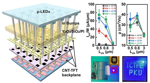 北京大学碳基电子学研究团队联合山西北大碳基薄膜电子研究院和南京大学,开发CNT-TFT驱动的Micro-LED微显示技术,通过引入Al2O3/SiO2栅介质叠层以及Y2O3/SiO2/PI钝化层,优化了CNT-TFTs的电学性能。采用通常紫外光刻制备的沟道长度3μm的CNT-TFTs开态电流达10μA/μm,迁移率达27cm2/(V∙s),可用于数百PPI(pixel per inch)分辨率的Micro-LED显示驱动;沟道长度的0.5μm器件开态电流达到80μA/μm、迁移率达到40cm2/(V∙s),可实现数千PPI分辨率的Micro-LED微显示。研究团队利用一种基于铟柱的共晶键合工艺,实现了2T1C CNT-TFT驱动背板和Micro-LED芯片的异质集成,键合成功率可达100%。团队开发了针对CNT-TFT驱动背板的像素驱动电路和外围控制电路,能够支持脉冲幅度调制(PAM)和脉冲宽度调制(PWM)两种驱动方式,成功制备并演示了首个碳纳米管有源矩阵背板驱动的Micro-LED微显示器,可实现静态和动态图像显示,被审稿人评价为“迄今为止展示的性能最强的碳纳米管驱动的LED显示器”,展示了碳纳米管在先进显示驱动技术中的应用潜力。