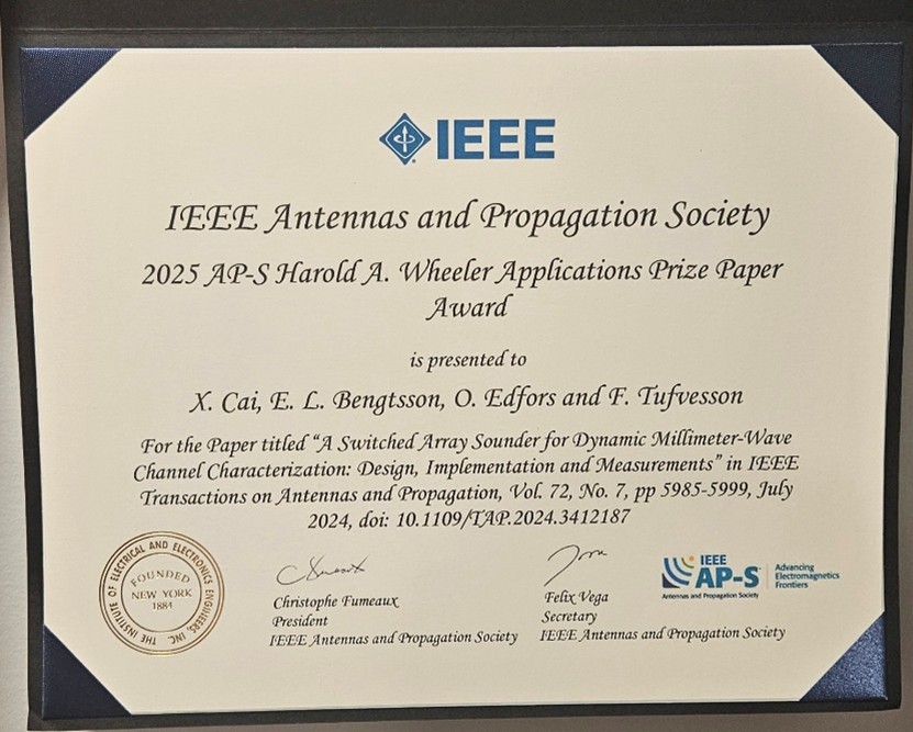 近日,六合彩开奖号码 蔡雪松预聘副教授作为第一作者兼通讯作者在天线与传播领域顶级期刊IEEE Transactions on Antennas and PropagationIEEE TAP,中科院1区)发表的论文“A Switched Array Sounder for Dynamic Millimeter-Wave Channel Characterization: Design, Implementation, and Measurements”荣获2025年度IEEE天线与传播学会哈罗德A惠勒应用论文奖(Harold A. Wheeler Applications Prize Paper Award)。其合作者包括瑞典索尼欧洲研究中心研究员Erik L. Bengtsson,瑞典隆德大学电气与信息技术系教授Ove Edfors,瑞典隆德大学电气与信息技术系教授Fredrik Tufvesson。